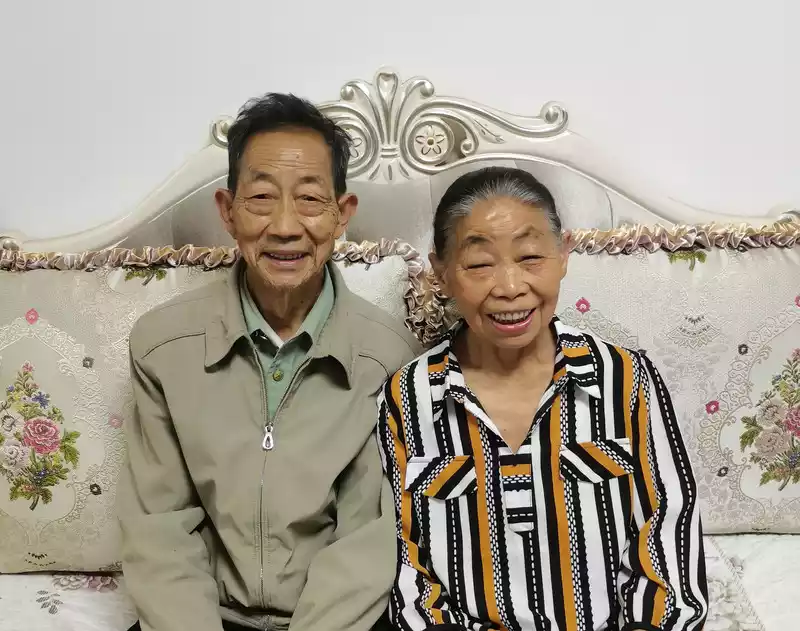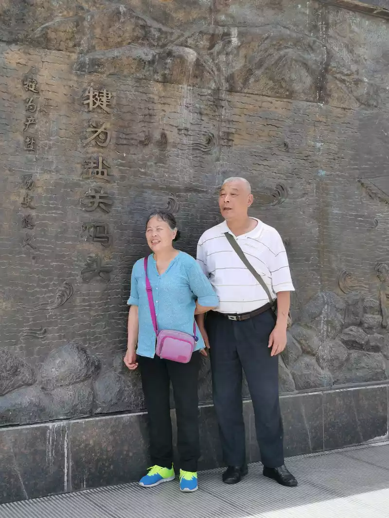 The old couple took a photo next to the wall with feelings of love for their hometown.