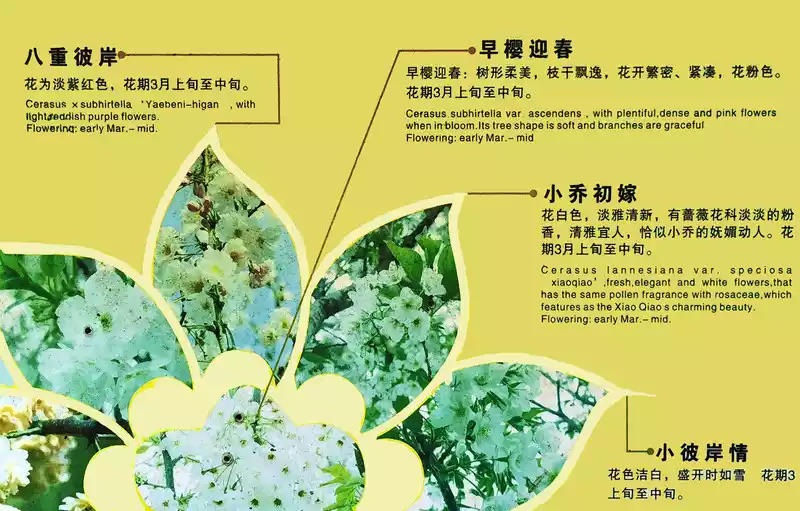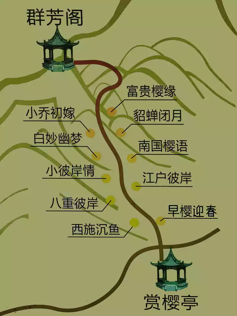 There is a path opposite it leads to "Qunfang Pavilion", along which are different varieties of cherry blossoms, and there is a picture next to it.