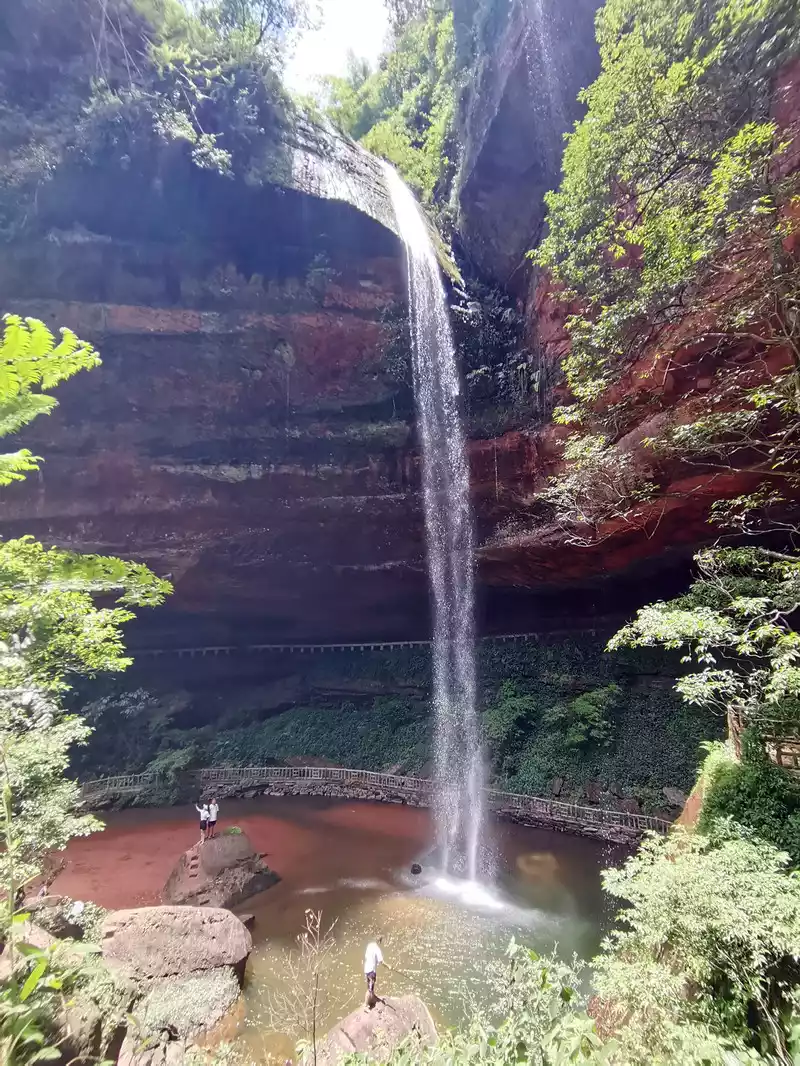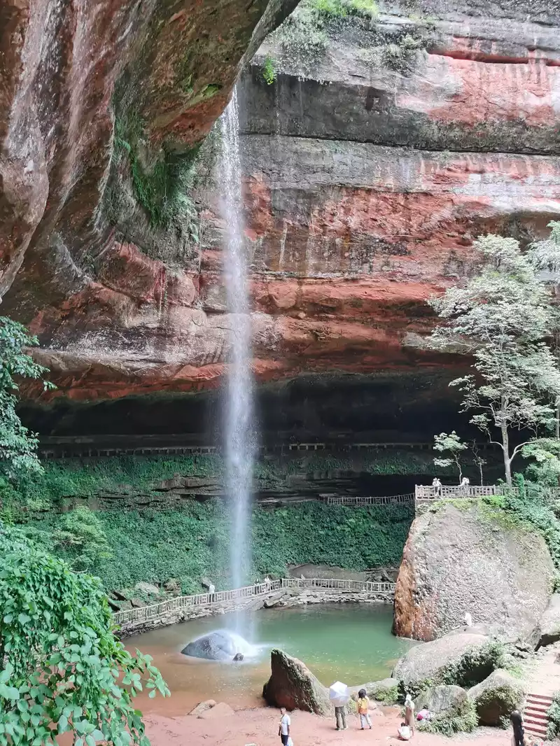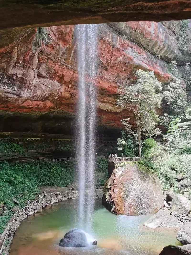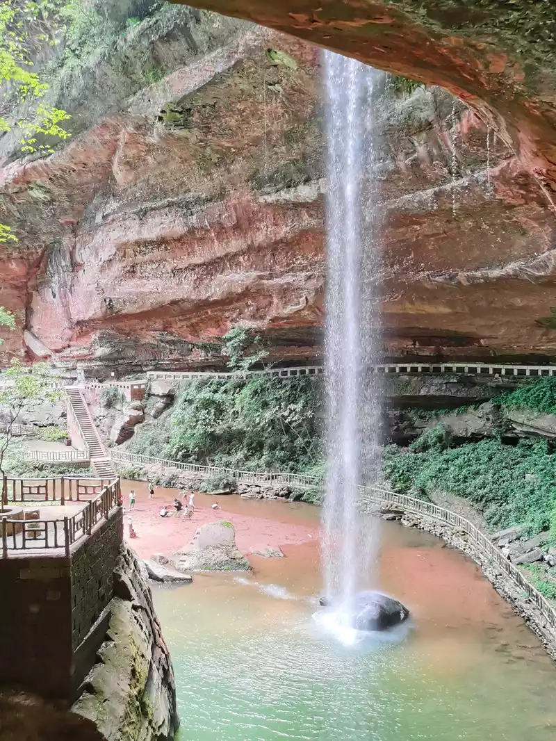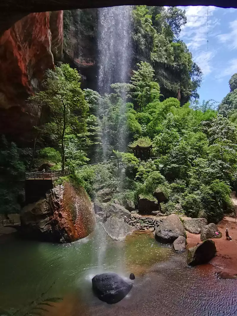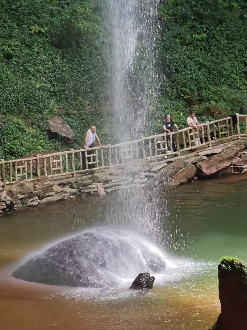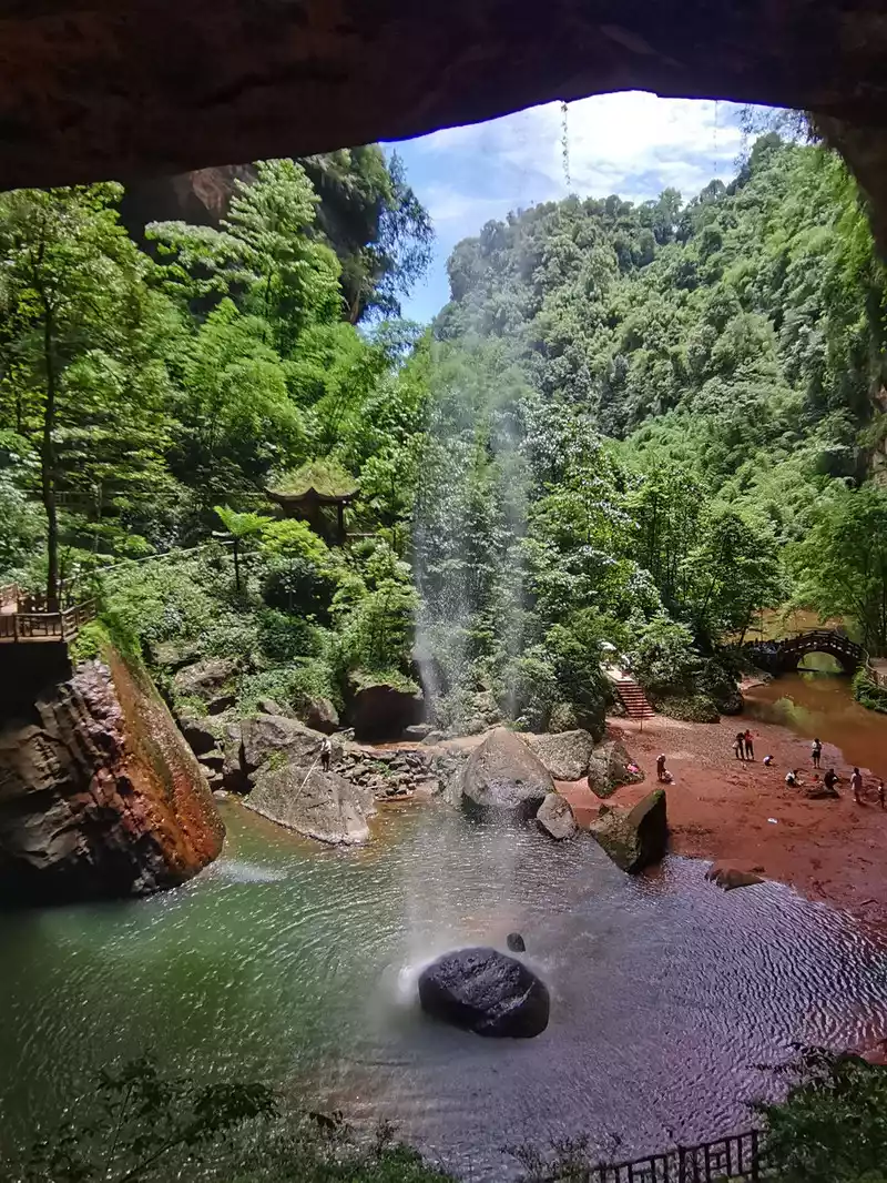 The waist of the three-sided stone wall is sunken into an inner ring stone wall corridor, called "Xiao Dongzi". A white water ribbon volleyed from the cliff at the top of the cave, directly hitting the center of the turtle stone of Bitan at the bottom of the cave, and the waterfall rose, forming the famous "Xiaodong Flying Rainbow".