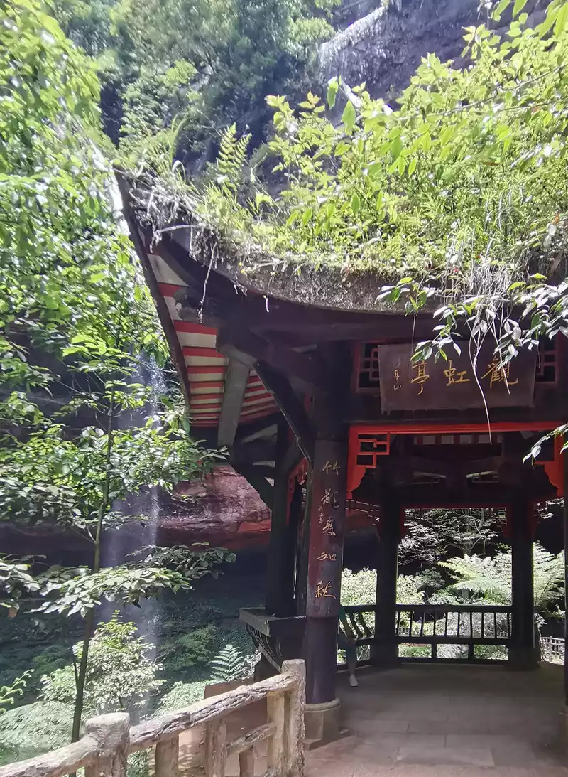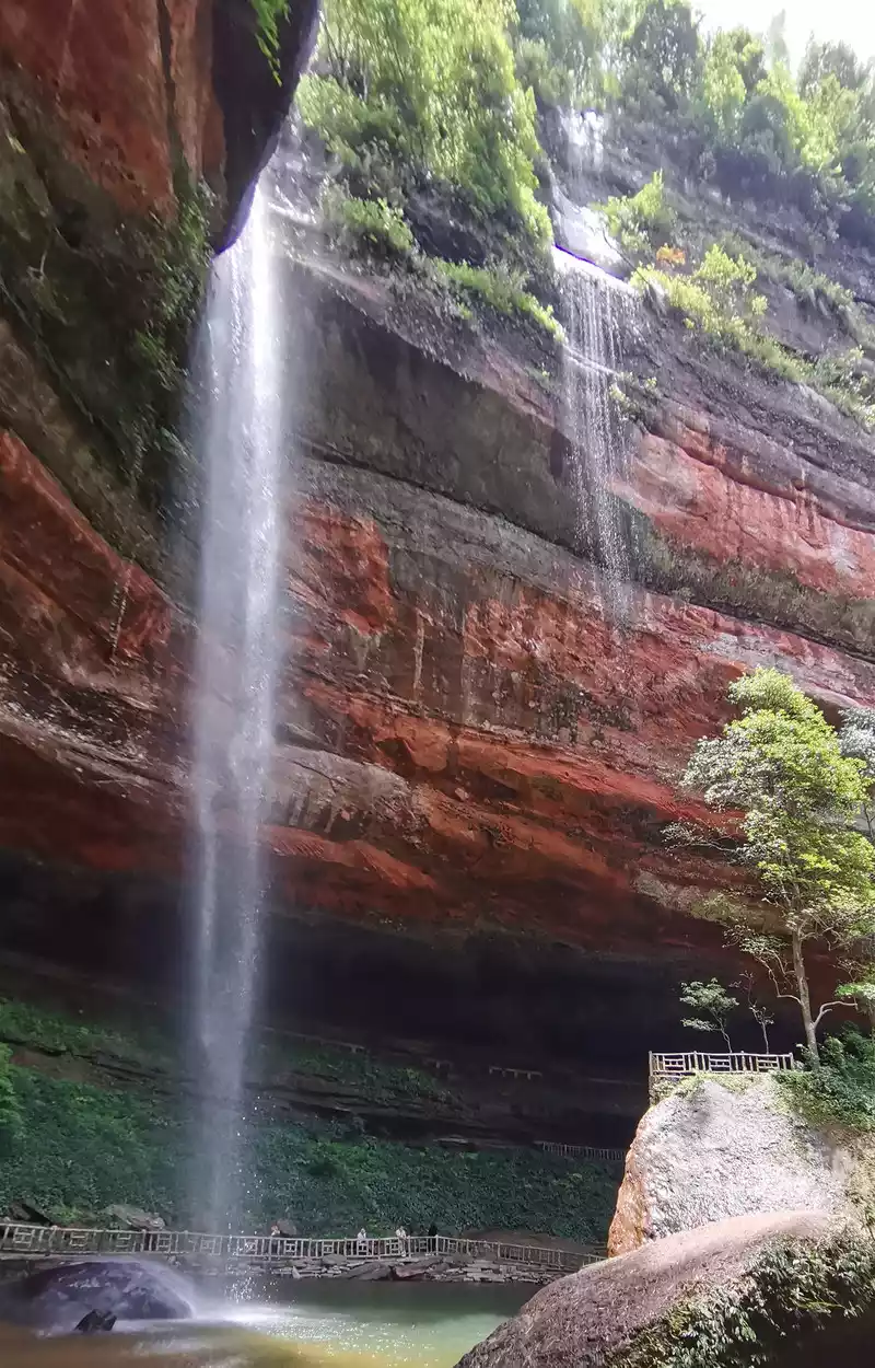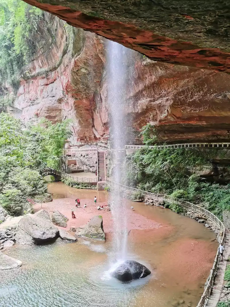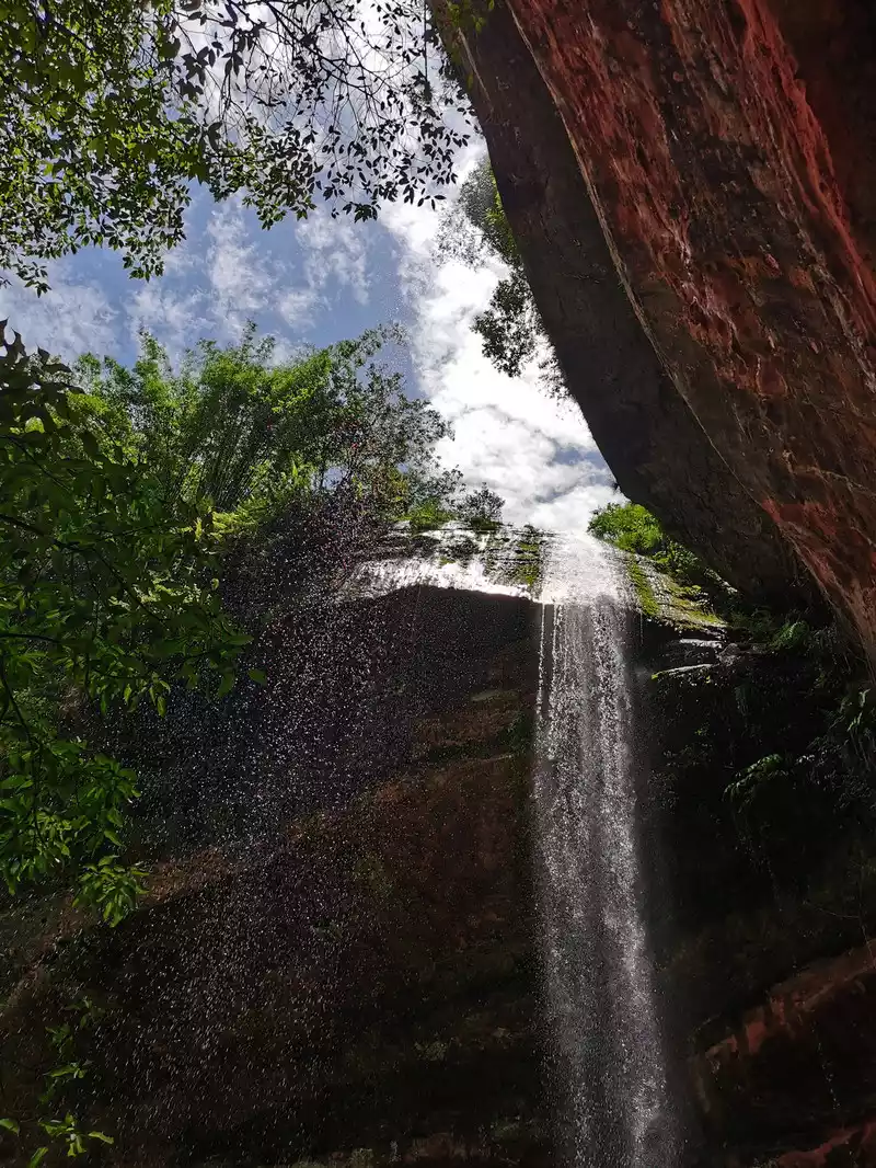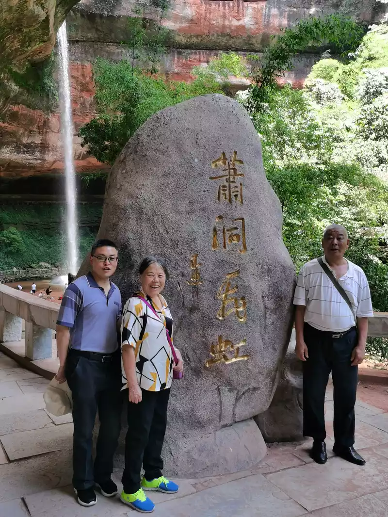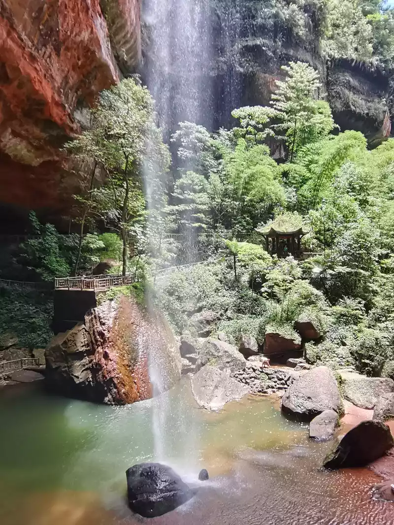 The waist of the three-sided stone wall is sunken into an inner ring stone wall corridor, called "Xiao Dongzi". A white water ribbon volleyed from the cliff at the top of the cave, directly hitting the center of the turtle stone of Bitan at the bottom of the cave, and the waterfall rose, forming the famous "Xiaodong Flying Rainbow".