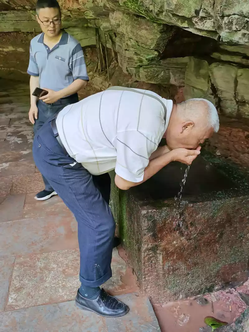 On the edge of the rock house, a clear spring leaches out, which is placed in a tank, and tourists drink it a lot, and the mountain people call it "holy water", which is said to cure all diseases. Take a sip gently, refreshing. The old gentleman took two sips of the spring water, and we went out for lunch.