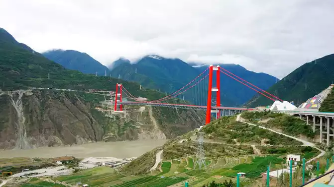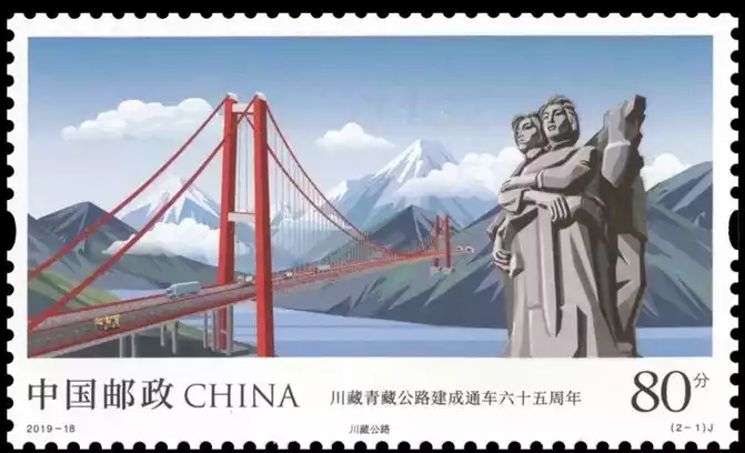 On June 22, 2019, several friends set off from Ningbo early in the morning and started a self-driving tour of the Western Sichuan Grand Ring Road. After driving for two days and traveling more than 2,200 kilometers, it passed the Luding Dadu River Bridge across the Dadu River in Luding County at about 18 p.m. on the 23rd. After crossing the bridge, we stopped on the shore and looked back, only to see the red steel truss suspension bridge hanging high on the river, which was imposing and particularly eye-catching (Figure 6). The high mountains on both sides of the river stand steeply, white clouds linger on the top of the mountain, and the Dadu River is surging and rushing. More than one month later, the stamp "65th Anniversary of the Completion and Opening of the Sichuan-Tibet-Qinghai-Tibet Highway" was issued, and the "Sichuan-Tibet First Bridge" appeared on the national business card (Figure 7). At dusk, we arrived at the Tibetan city of Kangding City under Paoma Mountain.