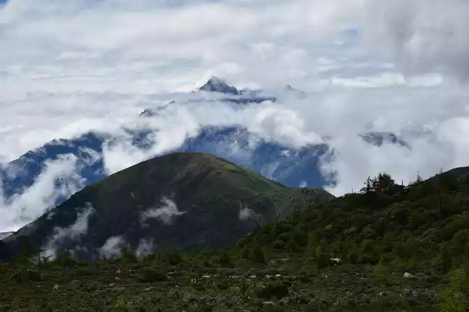 On June 26, after entering the Aden Scenic Area, take a sightseeing bus to Zhaguanbeng and first take a short route to the Pearl Sea (known as "Dolma Latso" in Tibetan) through Chonggu Temple. At an altitude of 6,032 meters, Xian Nai Ri (meaning "Guanyin Bodhisattva" in Tibetan) is the first of the three sacred mountains in the Aden Scenic Area, and its shape resembles a big Buddha with a body reclining back, and the peak is covered with snow all year round, majestic and magnificent, dignified and auspicious (Figure 11). Under the drifting and rolling of the clouds, they appear and disappear, changing everywhere, making everyone constantly guess and reverie. The sea of pearls formed by the melting snow of the day of the fairy is like an emerald embedded on the lotus throne, rippling with blue waves, and the reflection of snow-capped mountains and trees in the turquoise sea of pearls, forming a fairyland-like picture. From time to time, there was a rumbling thunder, it turned out to be an avalanche, and the ice and snow on the mountain poured down like a waterfall, which was majestic and spectacular. Sitting quietly by the lake, watching the clouds roll and relax, but the top of the mountain has always been shrouded in clouds, and we just wait like this. 4 hours passed, and I still couldn't wait for the clouds to peak, so I could only leave with a hint of loss. Unexpectedly, on the return train, the clouds on the top completely dispersed, and we finally got to see the whole picture of the Xiannai Ri Sacred Mountain.