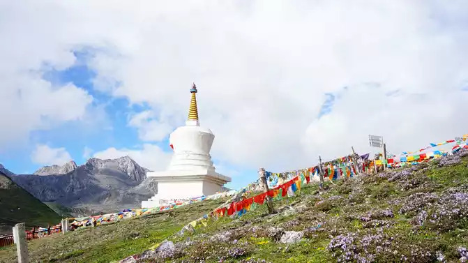 Then climb over Zheduo Mountain, along the nine bends and eighteen bends of the mountain road, bend after bend, crawl for half a day to reach the Yakou Observation Deck at an altitude of 4,298 meters (Figure 10), under the blue sky, the prayer flag is blown by the wind. The endless Gesang flowers on the hillside have become a sea of purple. When you get close to Xindu Bridge, there is an observation deck on the side of the road, and you can see the snow-capped main peak of Gongga Mountain by climbing up the high slope. We look at Gongga Mountain from different angles at different times, from three places far apart, and we can see the majesty of the king of Shu Mountain.