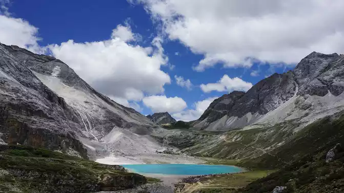 Get off the Luorong Cattle Farm tram stop, walk through a wetland meadow, and ride a mule up the mountain to the special horse farm. After getting off the mule, I began to climb up the steep mountain road with difficulty, walking for about 1 hour, and reached a three-way intersection, on the left was a flat road to the milk sea. We climbed a steep slope of about 500 meters to the right, and after climbing over a high slope, the five-colored sea (Figure 12) appeared on Yangmai Yong Snow Peak (meaning "Manjushri Bodhisattva" in Tibetan, 5,958 meters above sea level. ) between the embrace. Because of the reflection of snow-capped mountains and meadows, the water color looks ethereal and fantastic. Looking to the left, the sea of milk (Figure 13) surrounded by snow-capped mountains is shaped like water droplets, with blue snow water in the middle and a circle of milky white water around it. Looking around, Yang Maiyong and Xiano Dorji Snow Peak (meaning "Vajra Hand Bodhisattva" in Tibetan) seem to be within reach (Figure 14). It winds along the sharp blade ridges of the two wings of the triangular pyramidal snow-capped mountain, and the blade ridge is dark on the side of the light, and the lines outlined in the blue sky are sharp and stylish.Walking forward along the ridge, while admiring the snow-capped mountains and the sea, everything here is so pure and dreamy.