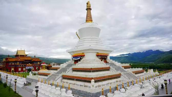 On June 29, I woke up in the morning and opened the window, and the snow peaks were in sight. Ganzi County is surrounded by several snow-capped mountains. The sun shines through the gaps in the clouds on the plateau under the snowy peaks, like a fairyland. By the way, I went around the White Pagoda (Figure 17) and saw many believers worshipping Buddha at the White Pagoda, they marched around the White Pagoda while chanting scriptures, and there were also monks chanting scriptures around the pagoda.