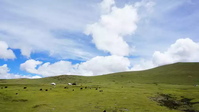 After eating at Litang at noon, we continued to move forward. The mountains are like daisies, the floating clouds are vast, the grass is green, the yellow flowers are everywhere, cattle and sheep are grazing, eagles are soaring, and the tents dotted with stars are like white jade (Figure 16), and the alpine pastures greet us with the richest colors. Then along the Yalong River Grand Canyon, the water in the canyon is turbulent, the sound is out, and occasionally you can see snow-capped mountains. There are few vehicles on the highway, and when you feel lonely, Tibetan villages, prayer flags, and temples appear on the side of the road, which makes people feel like they are back in the world. Arrive at Shanggra Hotel in Ganzi at 7:45.
