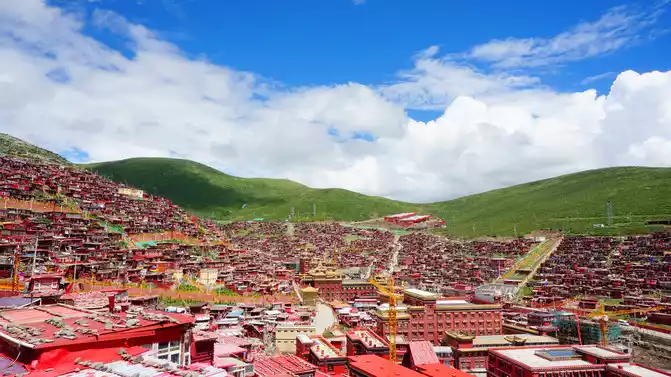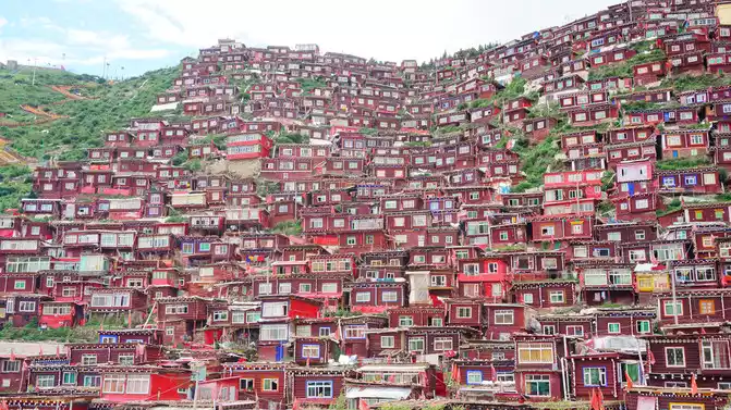 We climbed up the steps, climbed to the top of the mountain, and looked around, only to see the monk's house in the ditch, centered on the Great Sutra Hall of the Buddhist Academy, densely built on the hillsides on all sides, and countless crimson wooden houses, stretching countless and out of sight (Figure 19). These red houses are the residences of more than 10,000 monks. When I came here, I was deeply shocked by this hot red house and devout pilgrims!