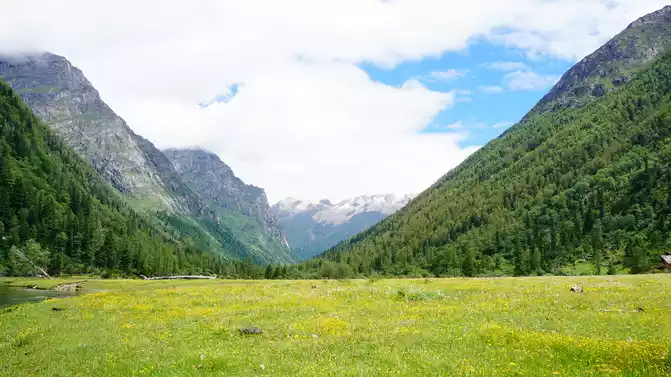 On June 27, the second entered Aden. The weather is good, and you can see the beautiful snowy peaks of the three sacred mountains on the way in by scenic bus. Transfer to a battery car to the 4150-meter-high Luorong cattle farm. The cattle farm is surrounded by continuous alpine meadows, wildflowers bloom on the meadow in early summer, all over the mountains, herds of cattle and sheep graze leisurely by the river and on the hillside, and the three snow-capped peaks stand not far away, a harmonious scene.