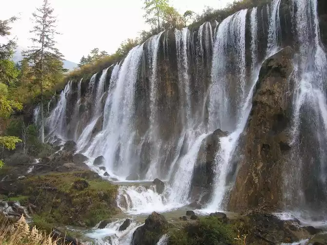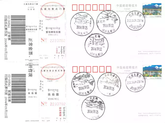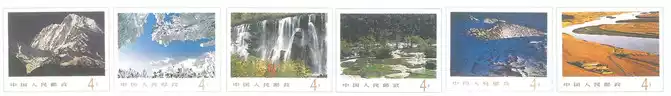 As early as 1989, the former Ministry of Posts and Telecommunications issued a postage postcard of "Sichuan Scenery", the cover used the Hailuogou Gongga Snow Mountain Rizhao Jinshan scene, among the 10 postcards, there are Jiuzhai Waterfall, Huanglong Autumn Colors, Top of Minshan Mountain, Hailuogou Gongga Snow Peak, Erlang Mountain Snow Scenery, Hongyuan Scenery and other 6 to show the scenery of western Sichuan (Figure 27). On New Year's Day 2003, Jiuzhaigou launched postcard tourist tickets with Nuorilang Waterfall as the main picture. When my friend went on a trip, he stamped 6 Jiuzhaigou scenery stamps on it (Figure 28). In 2004, Huanglong also launched the "Huanglong Competition Pool" special postage map postcard ticket (Figure 29). In 1998, "Jiuzhaigou" appeared on the national business card, showing the beautiful scenery of Changhai (Figure 30), Fangcao Sea, Wuhua Sea, Shuzheng Waterfall (Figure 31, envelope drawn by Zhang Youju, one of the stamp designers), and Nuorilang Waterfall. Unfortunately, in August 2017, the Jiuzhaigou earthquake caused the Nuorilang Waterfall to collapse. China's largest and most beautiful waterfall, frozen on stamps and postcards, has become an eternal memory.