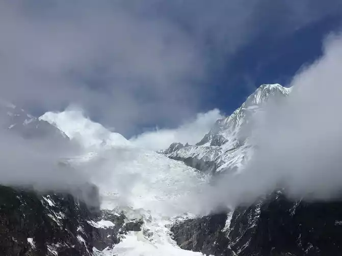 In the spring of 2016, I drove from Chengdu to Moxi Town to visit Hailuogou. The swaying pines and vines in the forest hang on the branches, and the clouds and mist are ethereal in the mountains, which is as beautiful as a dream. Crystal modern glaciers cascading down from high valleys are amazing. When the clouds that had shrouded him for many days dispersed and the veil of mystery was lifted, the main peak of Gongga shone in the sun, solemn and solemn (Figure 5), and the tourists at the scene exclaimed and worshipped. For this sacred moment, some tourists have been waiting here for a whole week.