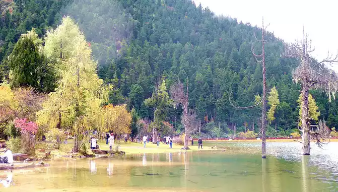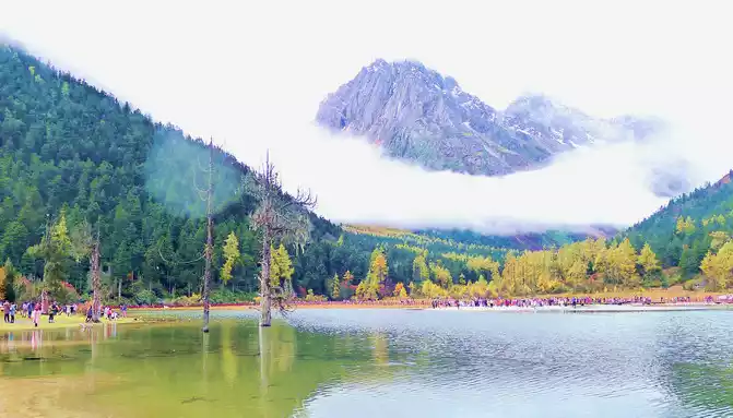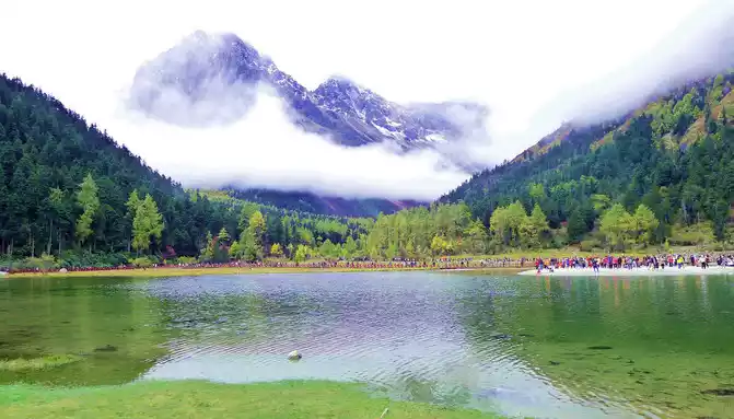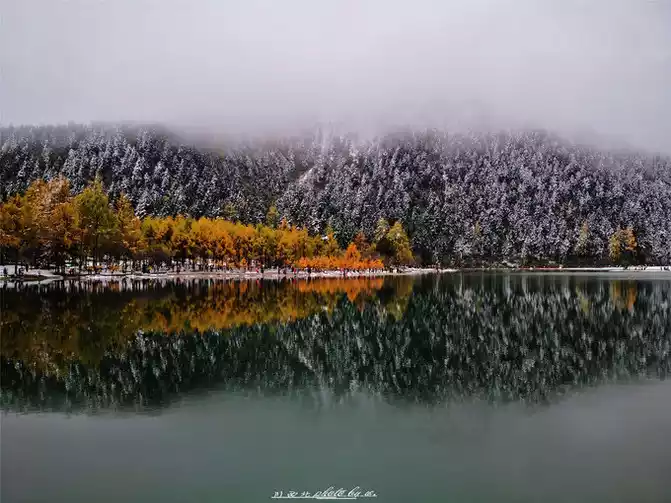 The footsteps of autumn have come to the mountains, the vegetation is changing color, and the conifers are still verdant, but the broad-leaved trees and shrubs and grasses by the lake have been dressed in autumn clothes early, showing different shades of red, orange and yellow. Thick green trees, deep red autumn leaves, green lakes, blue skies, and white snow on the top of the mountain, Panyang Lake has beautiful scenery and scenery like a dream and fantasy.