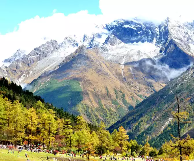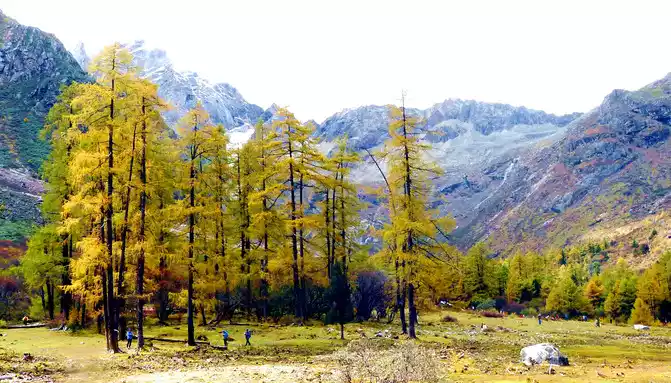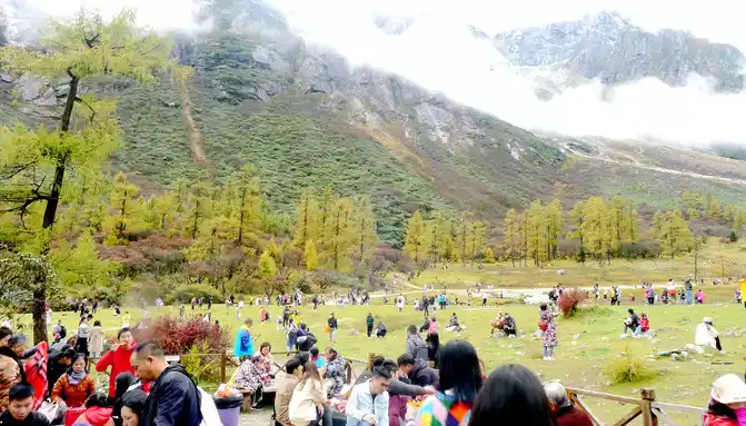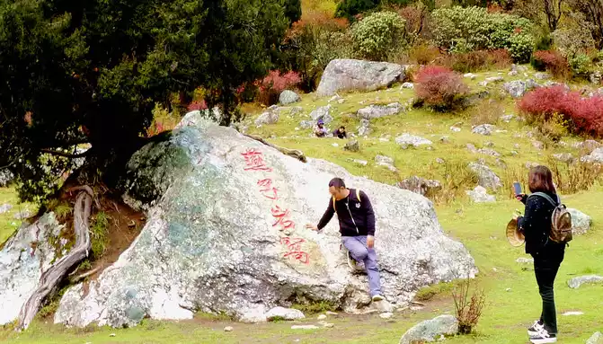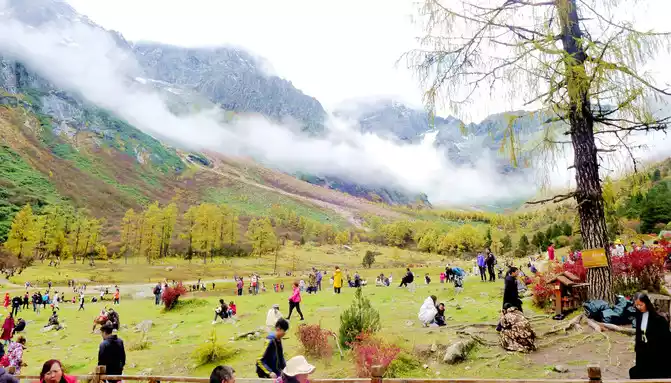 At about 12:00, we walked to the "Swallow Rock", which is 3837 meters above sea level, surrounded by snow-capped mountains, and in the middle is a large area of alpine meadows, with a boulder inscribed with "Swallow Rock Nest", which is the official name of the scenic spot, because there are swallows on the cliffs to build nests. Swallow Rock is adjacent to the famous "Siguniang Mountain" scenic spot, and the back of the snow peaks on the west and south sides is the "Shuangqiaogou" and "Changping Ditch" of the Siguniang Mountain Scenic Area, so Bipenggou is also known as the "beautiful back of Siguniang Mountain". During the National Day holiday, the vast meadow is filled with crowds.
