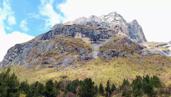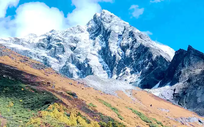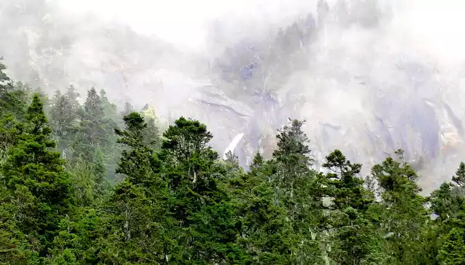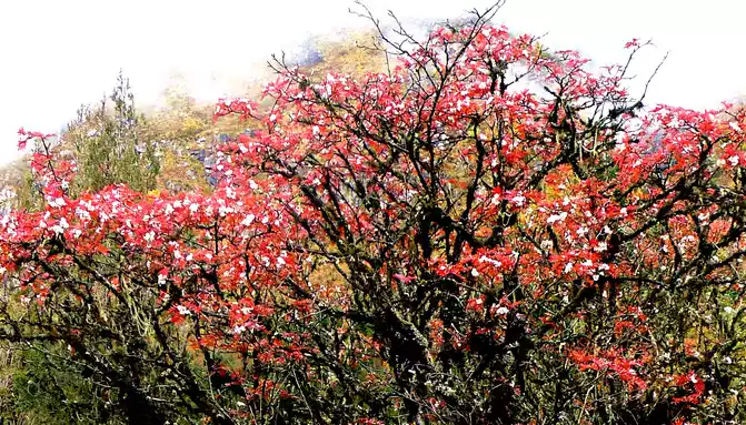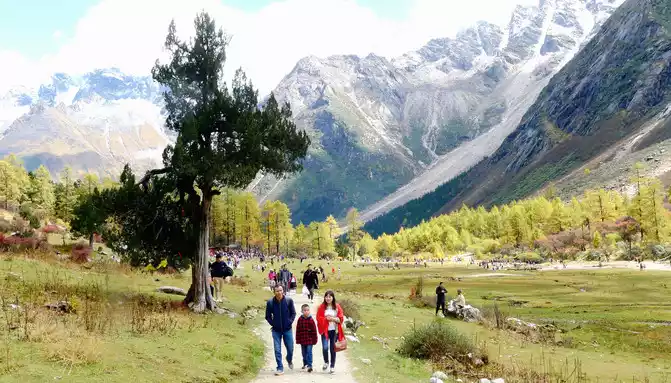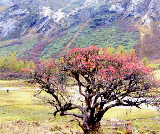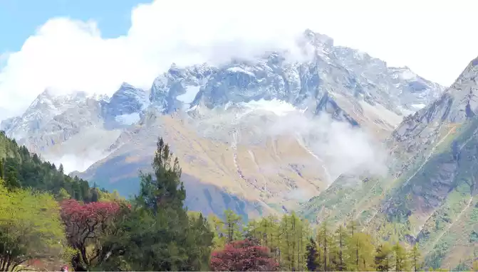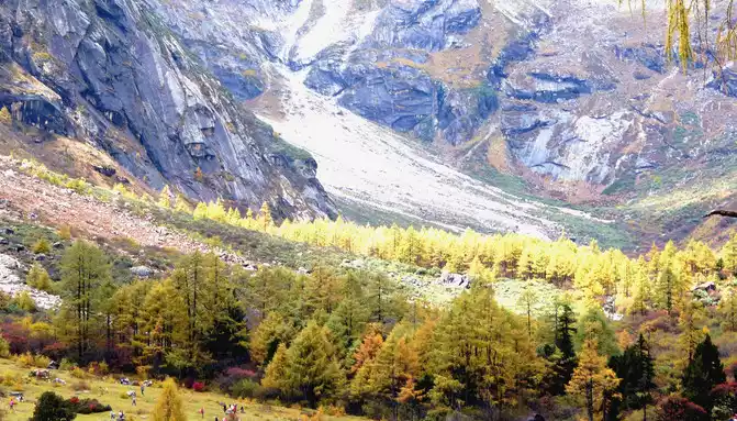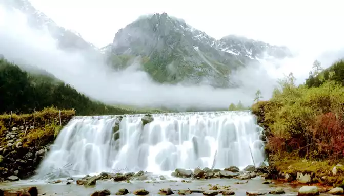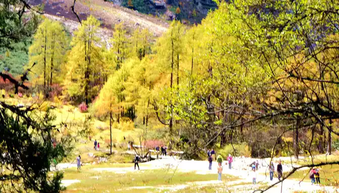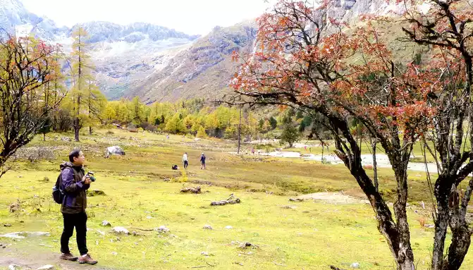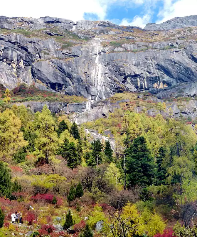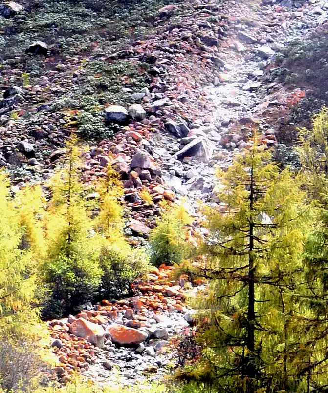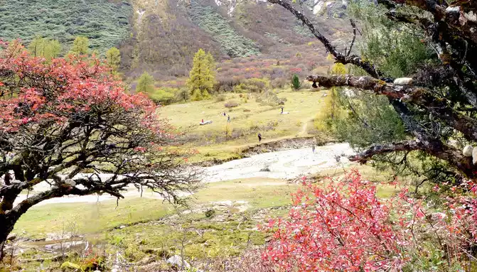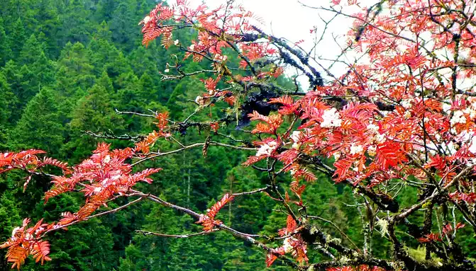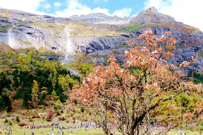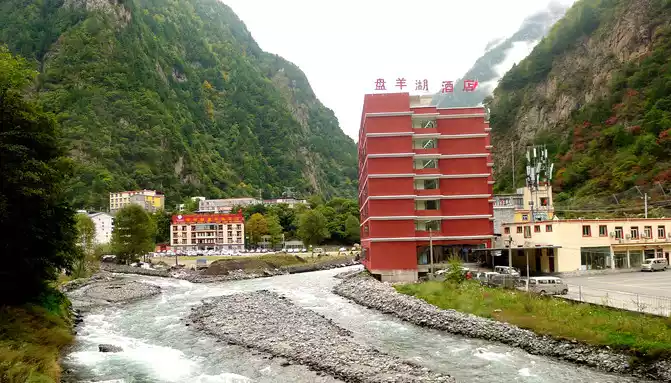 There is a waterfall on the nearby mountain, with a drop of 360 meters, known as the "Flying Dragon Waterfall", the water pours down from the cliff, passes several layers of rocks and disappears into the jungle, as if it is a white dragon flying in the mountains. There is also a red stone ditch on the opposite mountain, a glacial meltwater flows down from the top of the mountain, and the sides are covered with red stones, and the stone is red because it has a red algae attached to the surface, which has extremely high requirements for the environment, and can not survive if there is a little pollution.