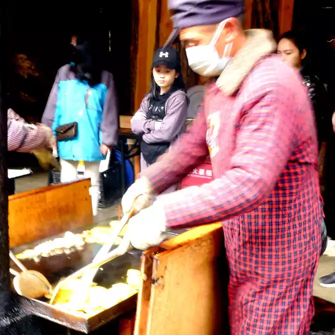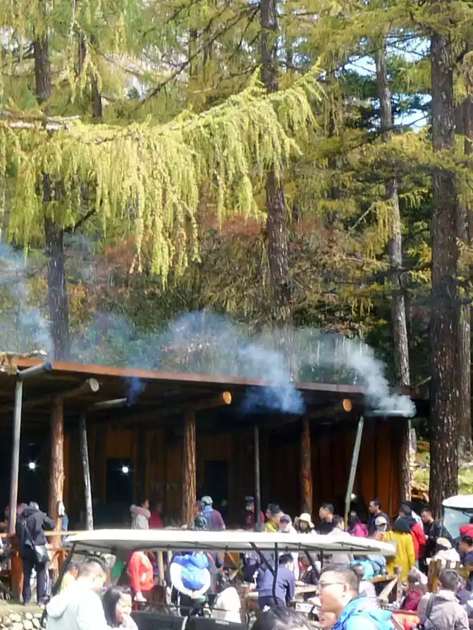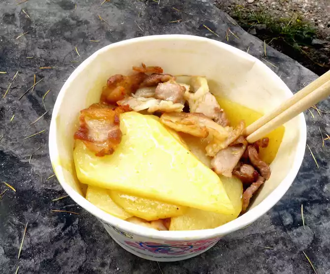 It's already noon, lunch is eaten first, and the local mountain people set up a shed near the entrance of the scenic spot to sell iron plate barbecue, and tourists first buy fresh ingredients by themselves, and then hand them over to the "chef" for processing. X.J. bought two large paper bowls of barbecue, which contained yak meat, pork belly and potato chips, totaling 100 yuan, the amount of meat was super sufficient, and the taste was excellent, and I was very satisfied. X.J. thinks it's a bit expensive, but I consider this is a scenic spot, the price should be okay, a month ago I had a hamburger set at the "McDonald's" at Xiamen North Railway Station and the "KFC" at Jiujiang Railway Station, the price is more than 50 yuan, and the burgers are only the size of a small teacup, compared with this big bowl of "teppanyaki", the cost performance is much lower.
