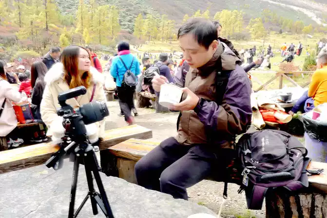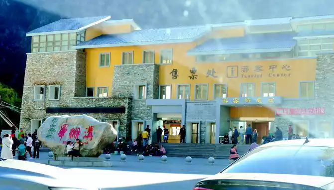 On October 5 (D2), the hotel provides breakfast, which is said to be a meal standard of 10 yuan/person, and is served from 7:30. At 7:58, after breakfast and checking out, the front desk was replaced by a "Han" little girl on duty, who asked if she was actually Tibetan, but she admitted that she had been Sinicized. The ticket office of Bipenggou Scenic Area is 1.5 kilometers away from the hotel, with a wide parking lot, and we arrived at 8:04, because we arrived early, there were many parking spaces, and the fee was 20 yuan/day. Tourists must take a sightseeing bus to enter the scenic spot, and the bus ticket is bundled with the scenic spot ticket, and I am free of charge (over 70 years old), but I still need to buy a sightseeing ticket.