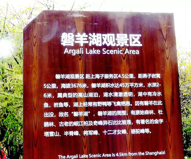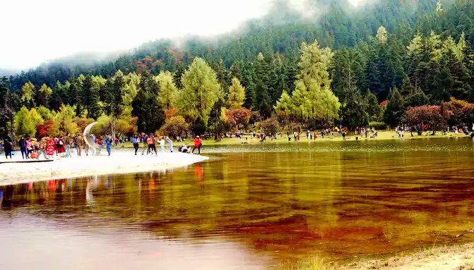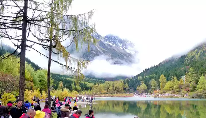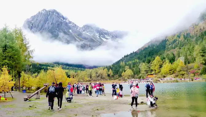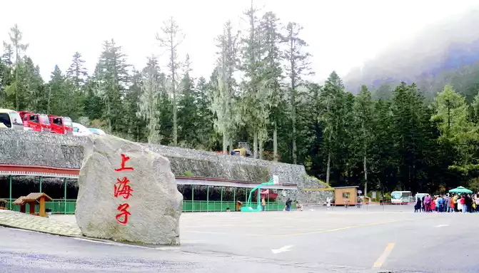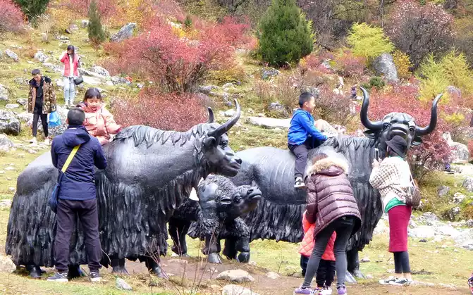 At 9:46, I got on the battery car and arrived at the "Panyang Lake" viewing area about 10 minutes later, probably because of the National Day holiday, the battery car was full at the beginning, and there was no stop along the way, so all the attractions located between Shanghaizi (the start of the battery car) and Panyang Lake (the end of the battery car) were not with the tourists. I visited Siguniang Mountain in September 2007, and the scenic traffic bus was like a bus, stopping at many scenic spots along the way, and it was very convenient for tourists to go up and down. I guess that if it weren't for the "golden porridge", the battery car here would also have an intermediate stop. The small square at the outlet of Panyang Lake is the terminal of the battery car, obviously because of the artificial damming, the outlet forms a small waterfall, behind the waterfall can see the snow-capped mountains, and there is also a "white dragon" in the mountains, the scenery is quite spectacular. Panyang Lake is named because of the frequent presence of Panyang around it, but at this moment, the lake is full of people, and Panyang should have fled far away, leaving only a Panyang sculpture still standing by the lake.