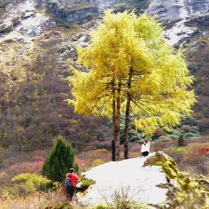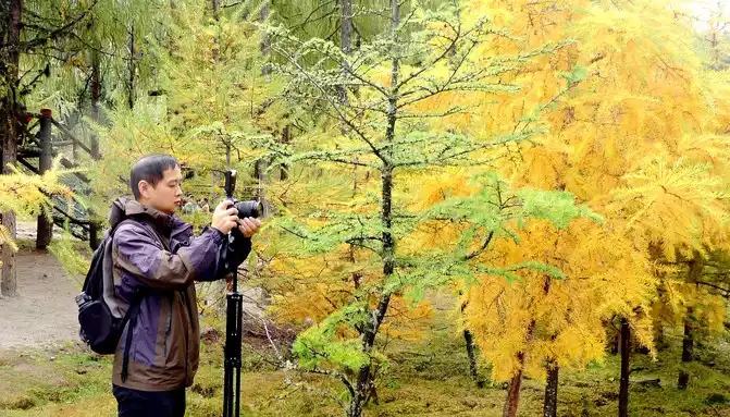 The two walked slowly around the big meadow, stopping from time to time to watch the scenery and take pictures, "Swallow Rock" is higher than the "Panyang Lake" altitude, the autumn color is more intense, most of the trees in the mountains have been changed into autumn clothes, and because the leaves are gradually changing color, even red, orange, yellow, green, there are different tones, looking around, bright red, light red, orange red, orange yellow, golden yellow, light yellow colors and dark green, light green, yellow and green that have not completely changed color blend with each other, layer upon layer, gorgeous and colorful, bringing us a time, Another surprise. The beauty of autumn leaves is not inferior to spring flowers, it is really "the autumn wind is strong once a year, not like spring, better than spring!" ”。