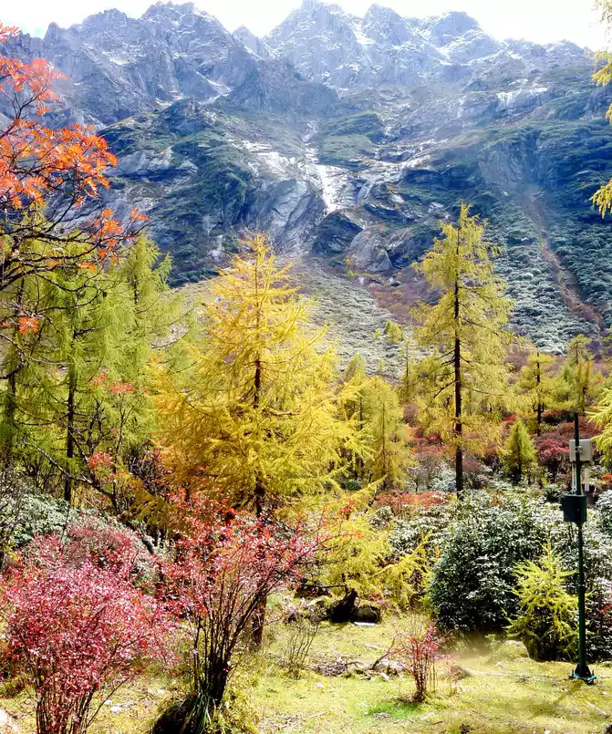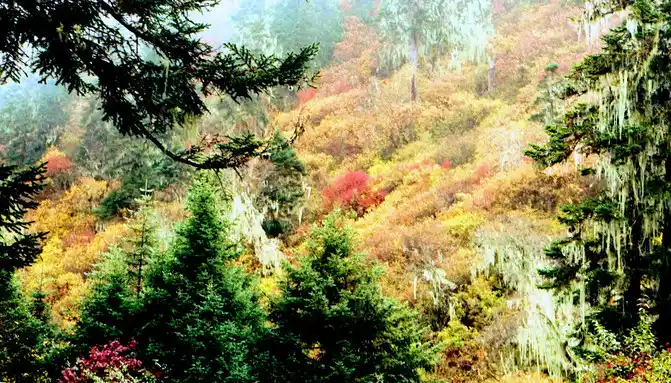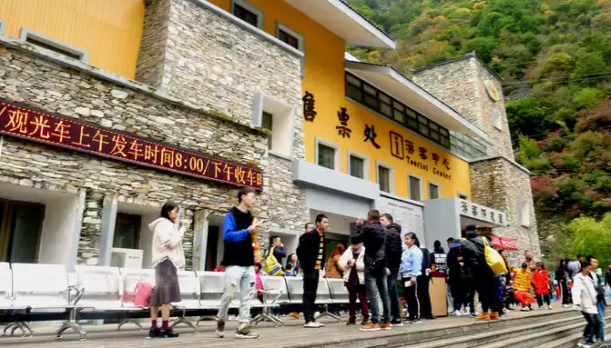 At 8:30, board the sightseeing bus, Bipenggou is a "natural ecological scenic spot", and the sightseeing bus can only go 27 kilometers deep into the scenic spot and arrive at the "Shanghai Sub-Tourist Service Center", and can not drive further into the core area of Bipenggou. We took a sightseeing bus into the deep mountains, and the grass and trees in the field of view had begun to change their clothes after the autumn wind and frost, and the red, orange, yellow and green were alternated, and the beautiful scenery of Bipenggou gradually became better.