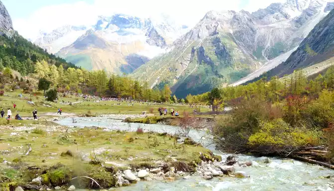 It took about 80 minutes, walked around the big meadow, at an altitude of more than 3,800 meters, and it would be difficult to walk too much, and I needed to take a deep breath from time to time. There were people everywhere during the November holiday, and a few of them said they were from Chengdu, some were traveling with their families to help the elderly, and some even brought a few months of babies. I asked what to do if they encountered a plateau, and they all said that it didn't matter, and the "high reaction" did not come immediately, it needed to have a brewing process, and they would not stay too long when they came up, and they had already gone down the mountain before the "high reaction" occurred.There is a clear stream in the center of the grassland, which originates from the surrounding snowy peaks, which should also be the source of Panyang Lake.