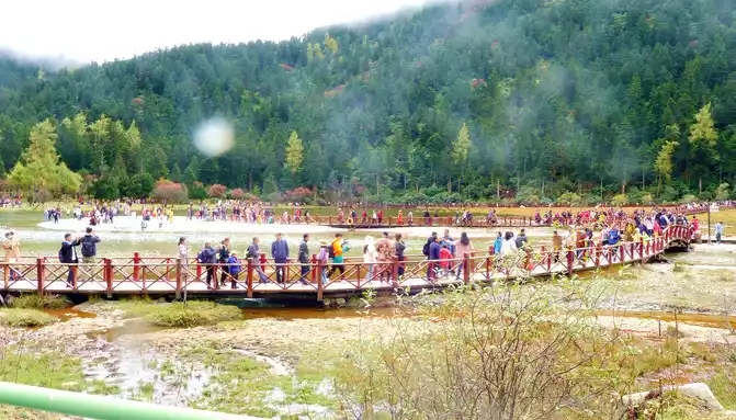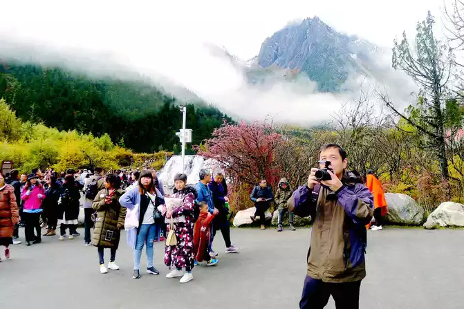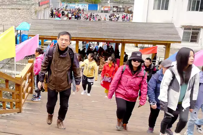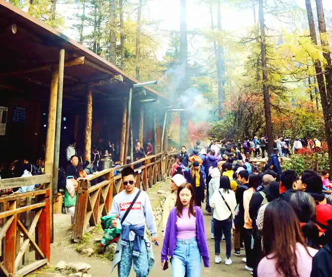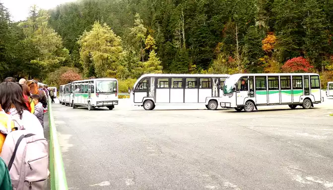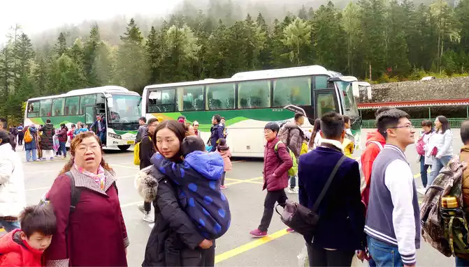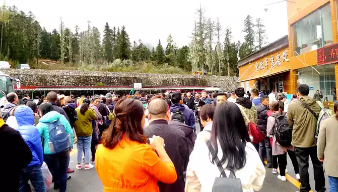 The "Shanghaizi" square was crowded, with long queues for tickets and rides, and the vast majority of tourists were from Chengdu. Bipenggou is known as the "Back Garden of Chengdu" because it is not far from Chengdu and can be traveled back and forth on weekends, which is especially suitable for Chengdu people to spend weekends. The National Day holiday is overcrowded, and sightseeing buses send tourists one after another, but there are also many battery cars prepared in the scenic spot, and tourists are sent away one after another. We queued up here to buy tickets and wait in line, which took about half an hour in total.