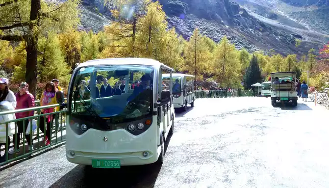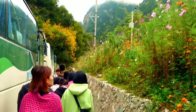 sightseeing buses depart from the ticket office at 8:00 at the earliest, there are many buses, although there is an endless stream of tourists, but the sightseeing buses are also one after another, You can get on the bus quickly after purchasing your ticket. Before boarding the bus, I already felt that the scenery was picturesque, the air was particularly fresh, and the small flowers on the hillside were also particularly watery.