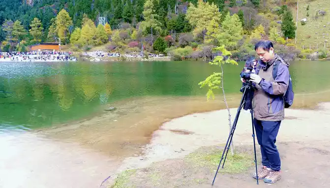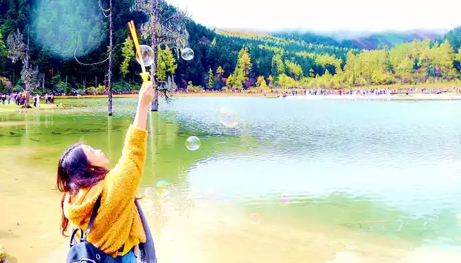 Panyang Lake is the largest lake in Bipenggou, with an altitude of 3,676 meters, a water depth of 2-6 meters, a water accumulation area of 450,000 square meters, and a clear and transparent water quality, which is a typical alpine lake. We walked along the east bank of the lake, from north to south, surrounded by towering snow-capped peaks, lush primeval forests, and beautiful scenery.The altitude of Panyang Lake is similar to that of Lhasa, Tibet, but there is no strange feeling when walking in it, and there seems to be no lack of oxygen in the air, which should be due to the dense vegetation. While walking, I suddenly saw a girl flying soap bubbles by the water, and the picture looked beautiful from a distance, so I took a picture with a telephoto photo.