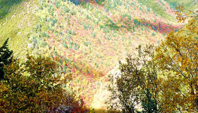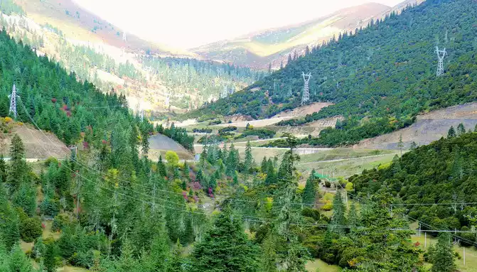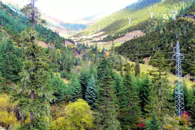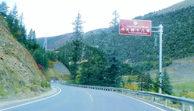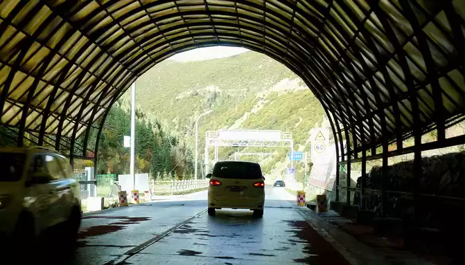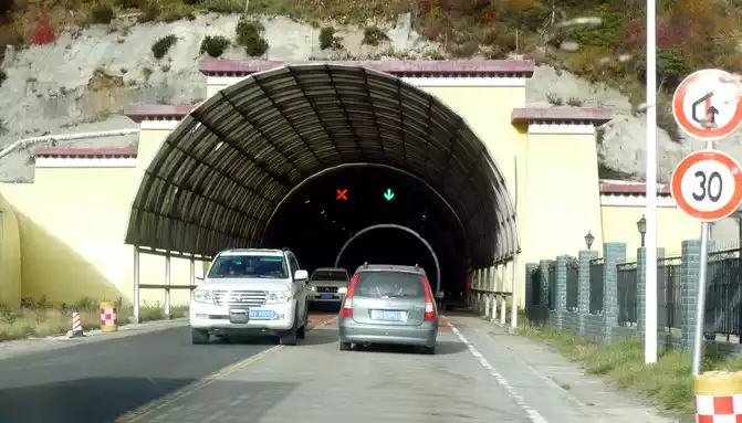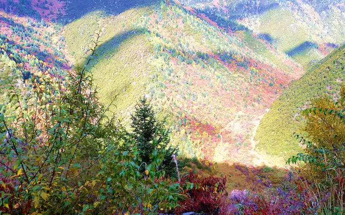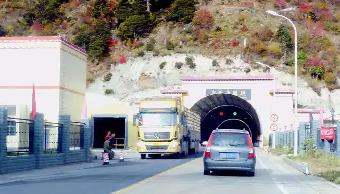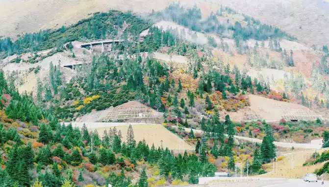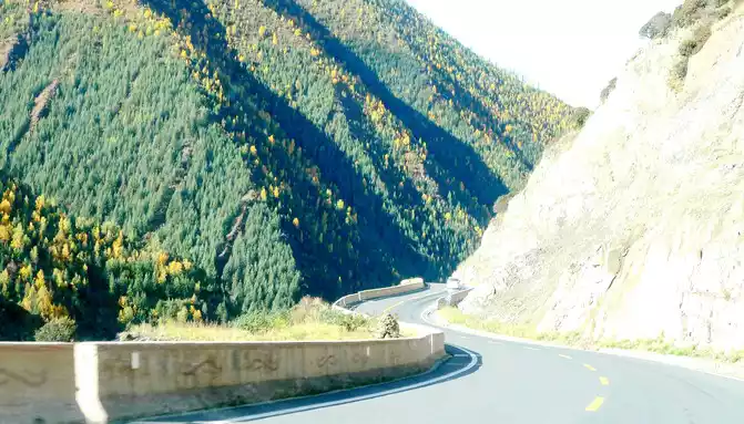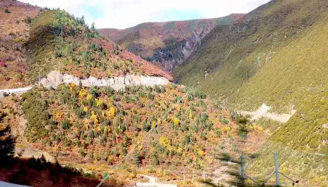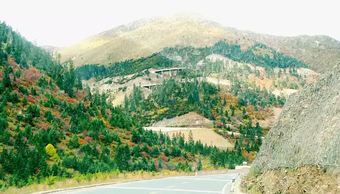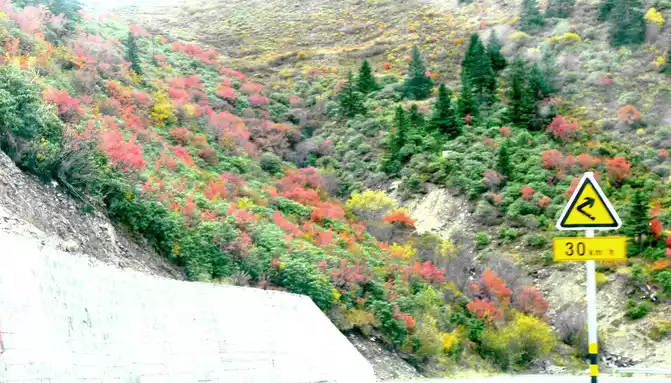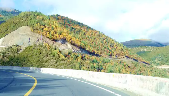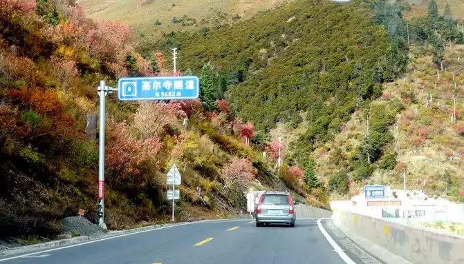 Continuing on, there is also a "Tianlu Eighteen Bends Tourist Comprehensive Service Station" on the mountain, we did not park, we left it for the return trip. At 11:07, we arrived at the end of the "Eighteen Bends of the Heavenly Road", and almost immediately entered the "Scissors Bend Mountain Tunnel". There is also a fork in the road nearby leading to the top of the mountain, and before the tunnel was built, the old national highway had to take this fork through the top of the mountain, over the scissors bend mountain beam at an altitude of 4,450 meters, and go to Litang. 11:13 Drive out of the west exit of the "Scissors Bend Mountain Tunnel", what you see in front of you is immediately very different from the east end of the tunnel, the tunnel entrance at the east end is green, as if autumn has not yet arrived, but the west entrance of the tunnel is red, orange, yellow, green, four colors are mixed, the season is already late autumn.