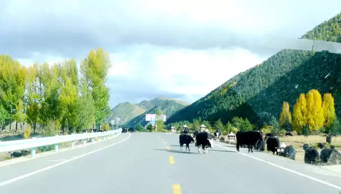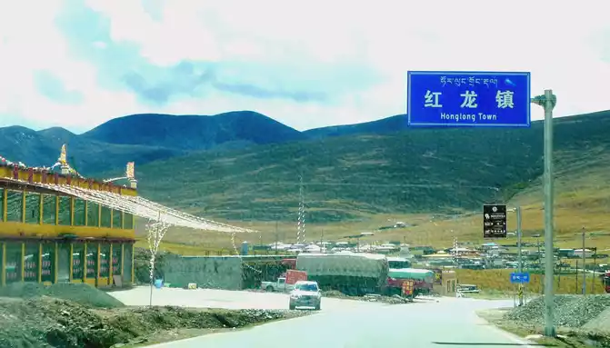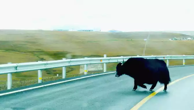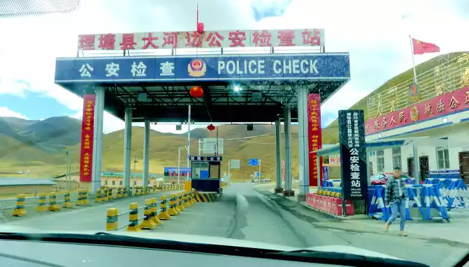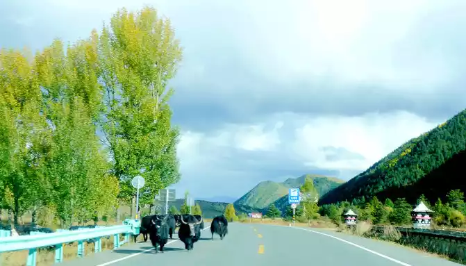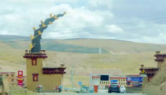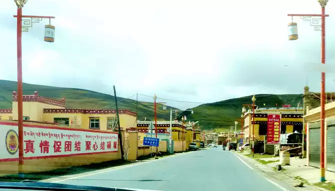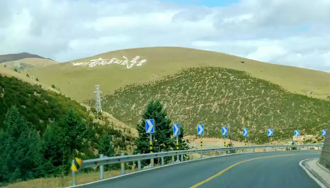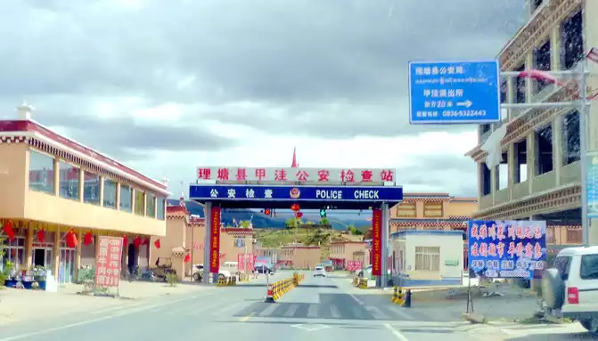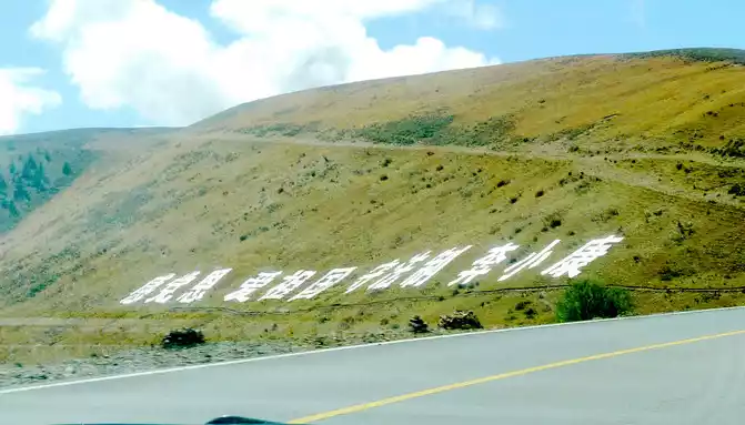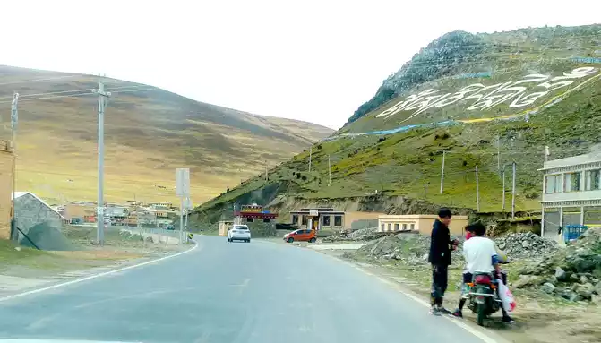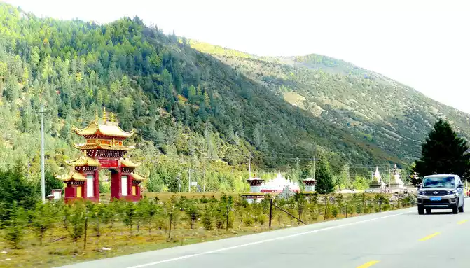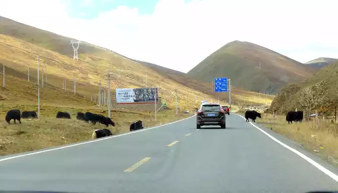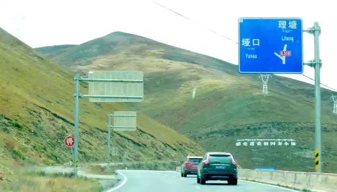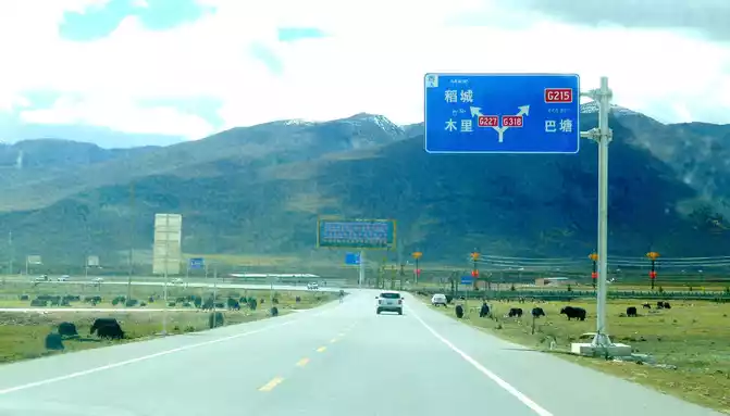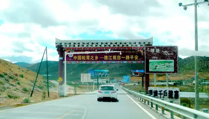 12:13 Leaving the observation deck, continue along the national highway G318, crossing the pastoral area on the way, the free yaks run directly onto the road, and be especially careful when driving when encountering them, because they don't care about cars and behave unpredictably. At 12:37, we drove past the "Red Dragon Town", at 12:38 we saw the Tibetan characters "Oh Mani Ni Mei Coax" on the hillside of the road, and at 12:57 we passed the archway of "China's Matsutake Hometown - Yajiang Wishes You a Safe Journey", we drove out of Yajiang and entered Litang County.A minute later, it passed through the "Litang County Dahebian Public Security Checkpoint", unmanned, which is still 6 kilometers away from Litang County.