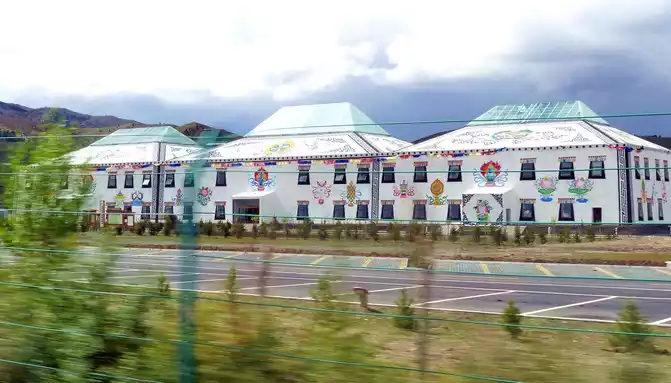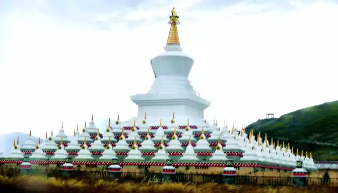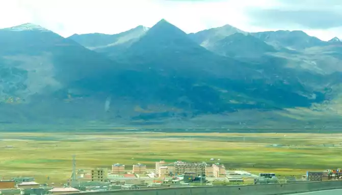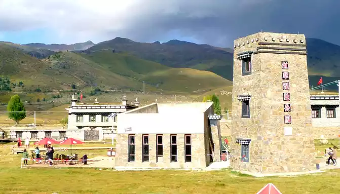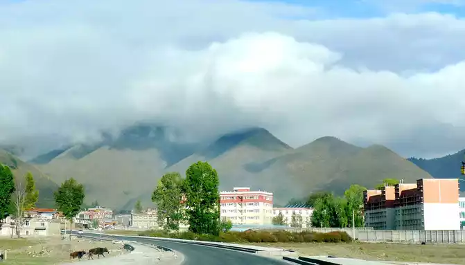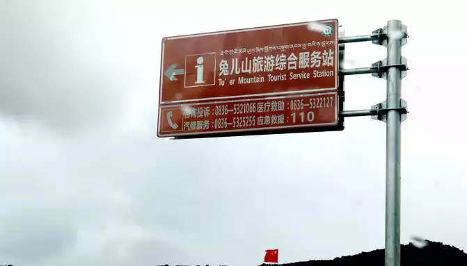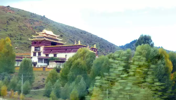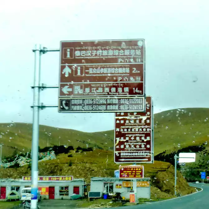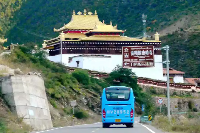 Soon after driving, there was a steep slope ahead, and there was a winding mountain bend again, we snaked uphill and arrived at the top of the mountain at 18:04, where the "Powa Mountain Service Area" was set up, and the sign showed an altitude of 4,513 meters. It was raining lightly on the top of the mountain, more precisely "sleet", we didn't stop and went straight down the mountain, but there was no rain at the bottom of the mountain. 18:44 See the splendid "Gonggalang Jiling Monastery", in today's Tibetan area, both large and small temples have golden roofs.