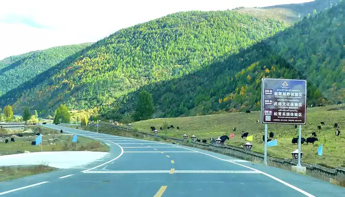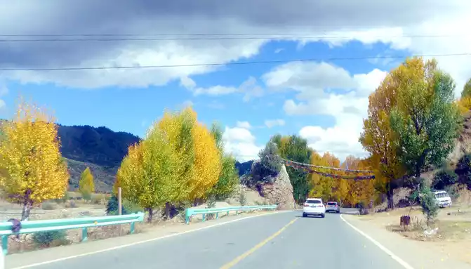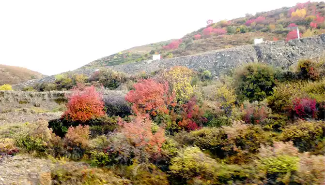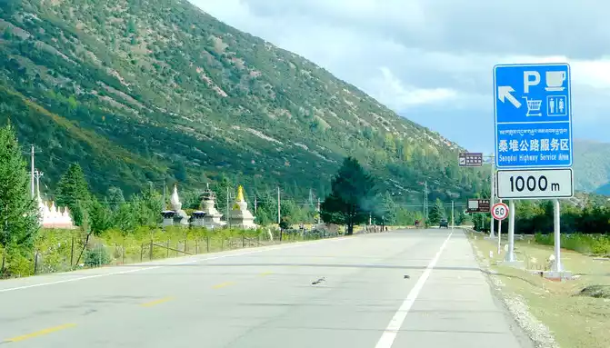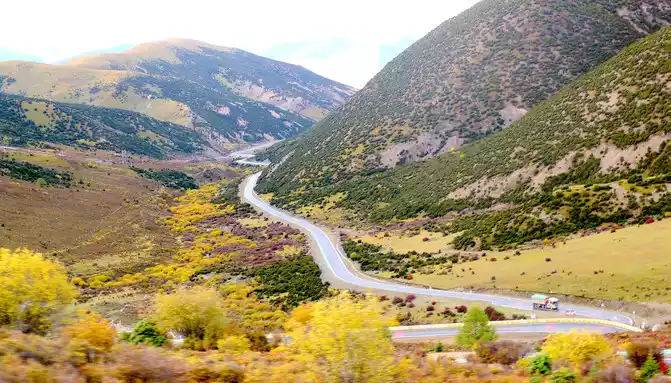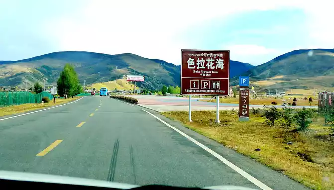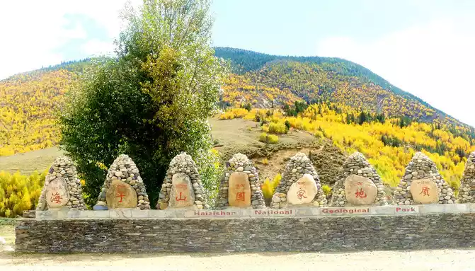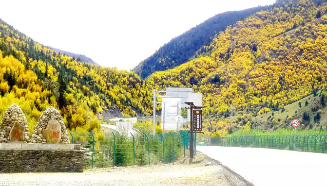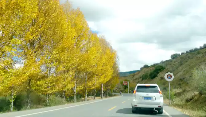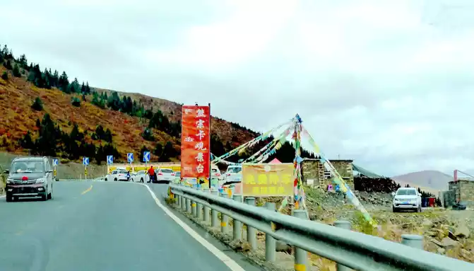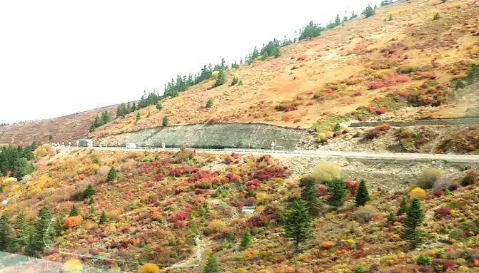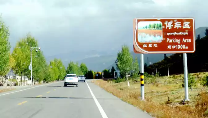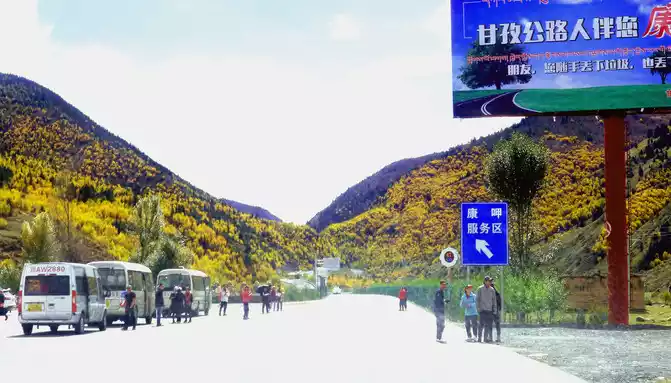 At 14:26, drive into the "Kangxia Service Area", where there is a sign of "Haizishan National Geopark", and there is a mountain pass in front of the highway, which should be the entrance to the geopark. In autumn on the plateau, the pace is very fast, and the trees on the surrounding hillsides have also changed into autumn clothes early. It is also home to road classes, with extensive parking lots, public toilets, and local Tibetan stalls selling food and paid horseback riding.