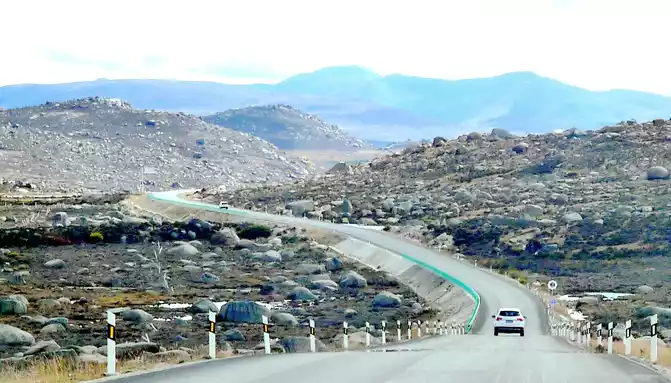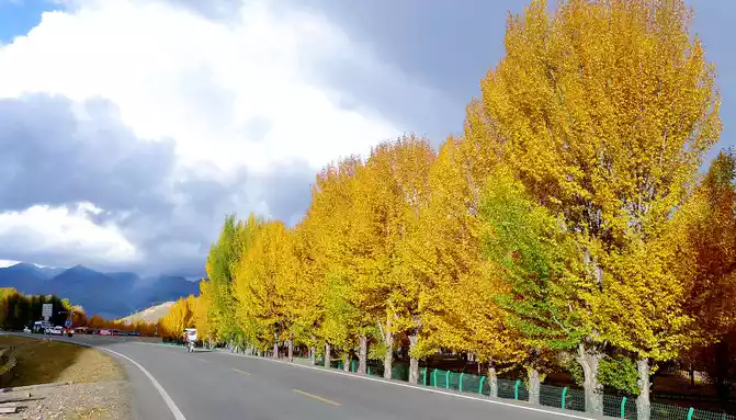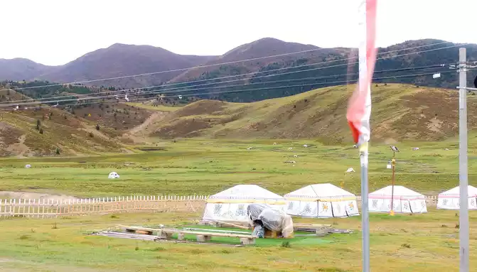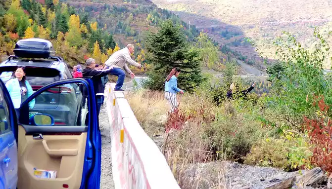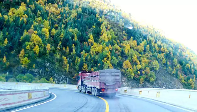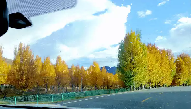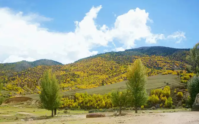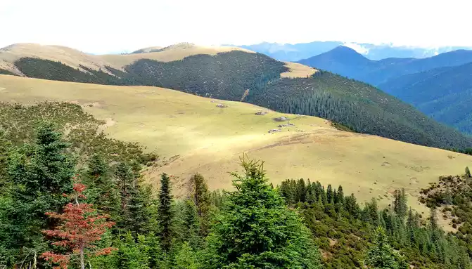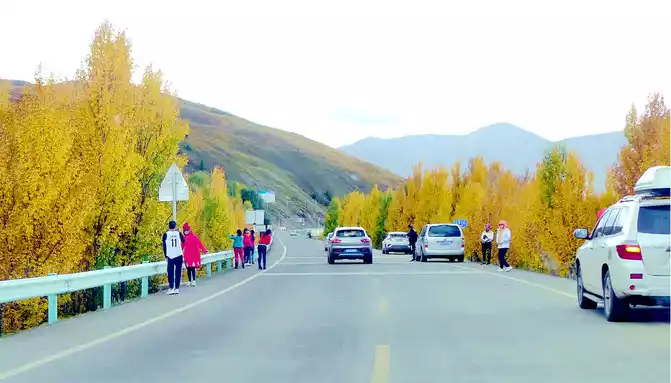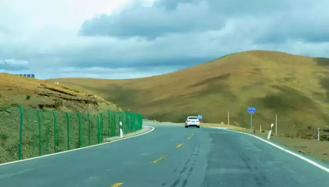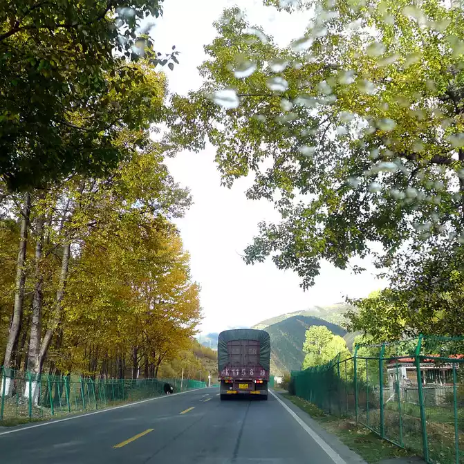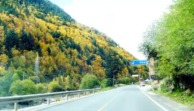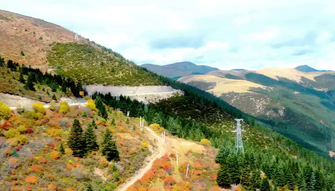 At 14:26, drive into the "Kangxia Service Area", where there is a sign of "Haizishan National Geopark", and there is a mountain pass in front of the highway, which should be the entrance to the geopark. In autumn on the plateau, the pace is very fast, and the trees on the surrounding hillsides have also changed into autumn clothes early. It is also home to road classes, with extensive parking lots, public toilets, and local Tibetan stalls selling food and paid horseback riding.