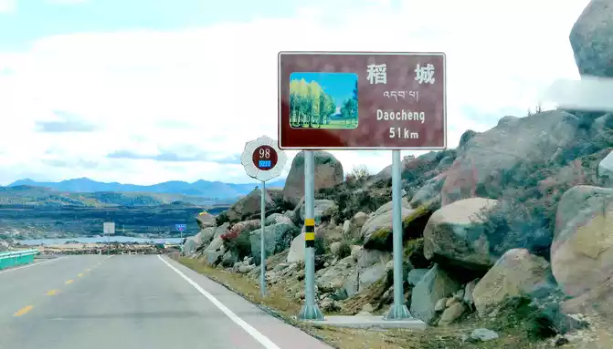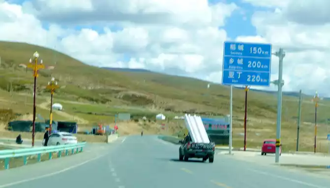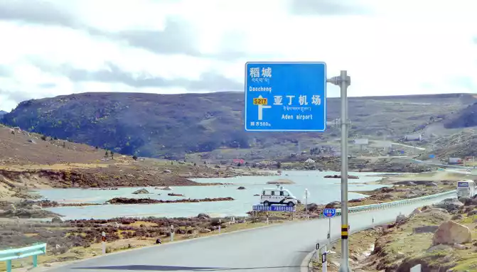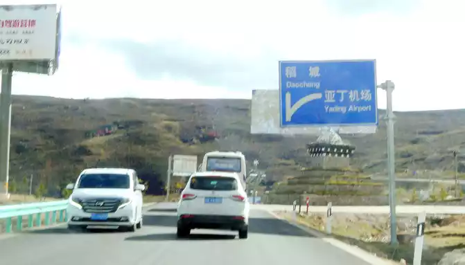 The observation deck is 51 kilometers away from Daocheng, and we continue on our way, and further on, there is a long road down the mountain, because of the frequent accidents, the relevant authorities placed abandoned police cars on the side of the road to fool and deter drivers. 16:18 Drive through the three-way intersection of Aden Airport, there is a Tibetan "pyramid" in the middle of the intersection, the right fork leads to the airport, we go straight along the left side, continue to Daocheng, which is 40 kilometers away from Daocheng and 140 kilometers away from Aden.
