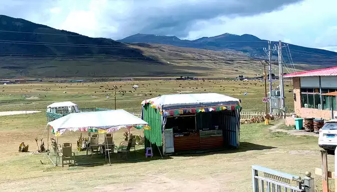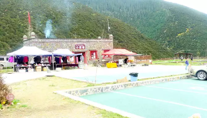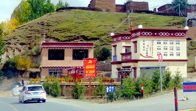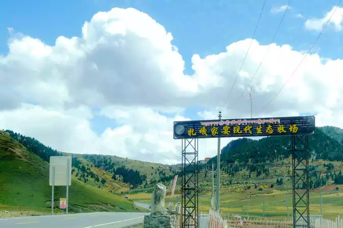 At 13:39, passing by the "Zaga Family Banquet Modern Ecological Ranch", the text in front of the door introduced that this is a poverty alleviation project led by several Tibetan party members to lead difficult households to a well-off life, which seems to be related to tourism. We stopped in the open space in front of its door, and with the last bit of bread and red sausage brought from Xiamen, we made do with a casual lunch here.