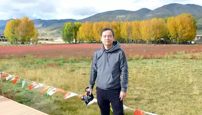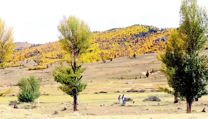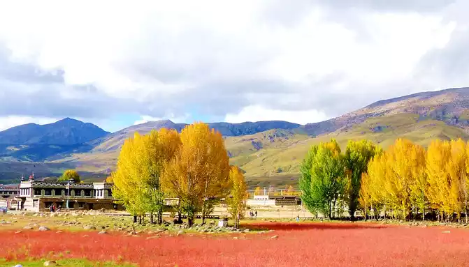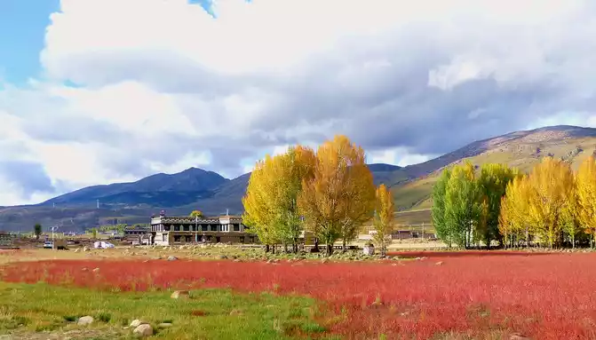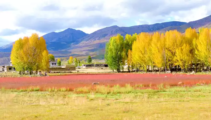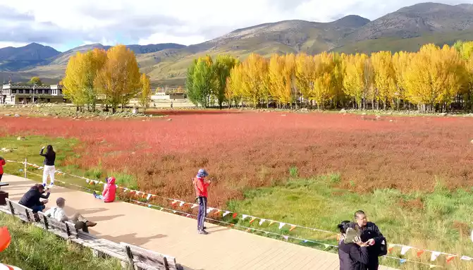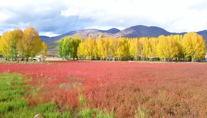 "Red grassland" is a seasonal wetland, after the rainy season accumulates water, a plateau endemic plant called "water smartweed" will grow, in autumn the "water smartweed" plant turns red, the whole wetland appears fiery red, coupled with rows of golden autumn poplars behind it, the scenery is not ordinary beauty.
