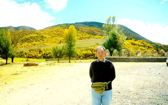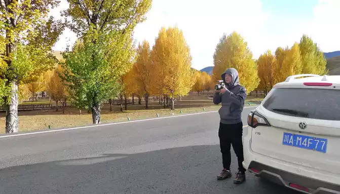 17:28 We saw a large group of white gold-roofed towers on the right side of the road, we still didn't park, this place was already a suburb of the county seat of "Daocheng", we passed around the city.There are still 78 kilometers left in "Shangri-La Town", in order to ensure that we can arrive before dark, we agreed not to stop along the way when we set off from the "Red Grassland", however, at 17:33, we saw a large area of gold on the side of the road, and many people were taking pictures, we couldn't stand the temptation and stopped again.