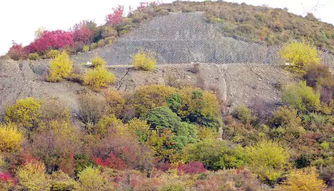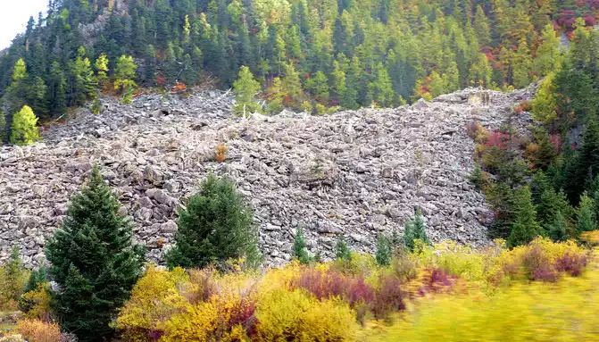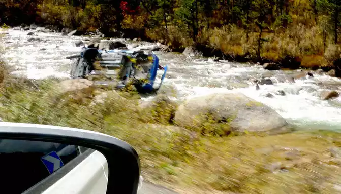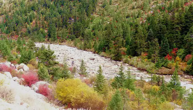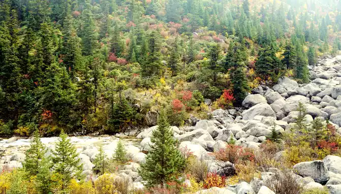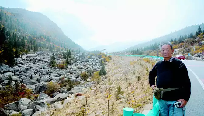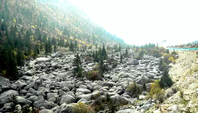 After a short rest, we drove into the mountain pass ahead, and even if we entered the "Haizishan National Geopark", the road followed a turbulent stream upstream and continued to climb higher. At 14:42, I saw the wreckage of a blue car, falling into the stream, the color seems to be quite new, it should be a recent accident. At 14:48, we arrived at the "Stone River" observation deck, and there was also a sign on the side of the road that said "Puyonggou River Valley Autumn Photography Spot", guessing that the roadside ravine should be "Puyonggou", which was stuffed with boulders, which were the relics left by ancient glacial movements. The valley is in full swing in autumn, and the surrounding hillsides are colorful, so it's no wonder it's called an "autumn photography spot".