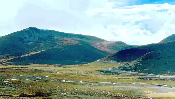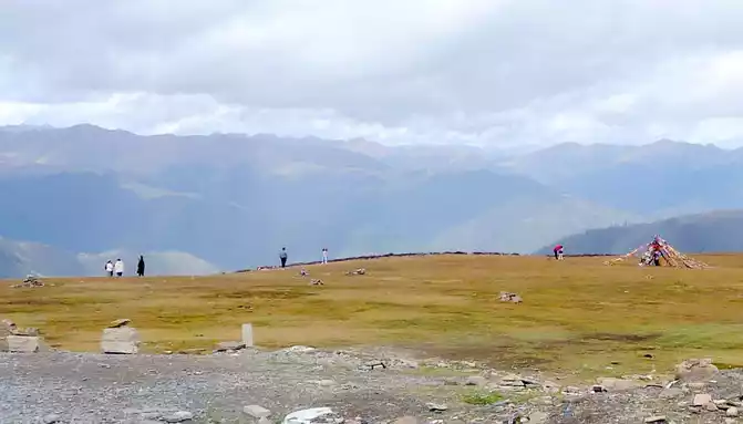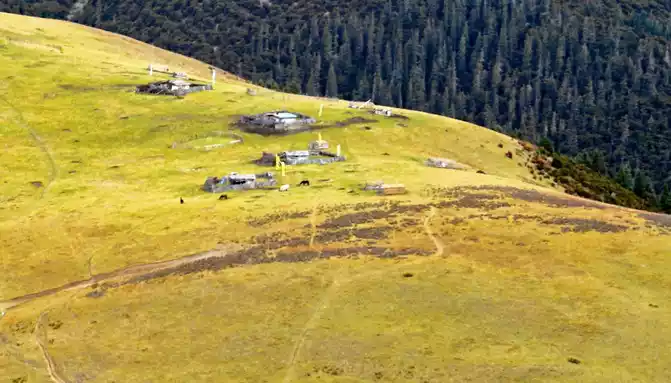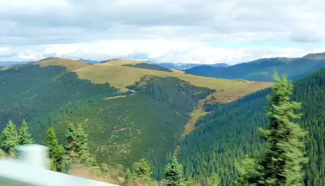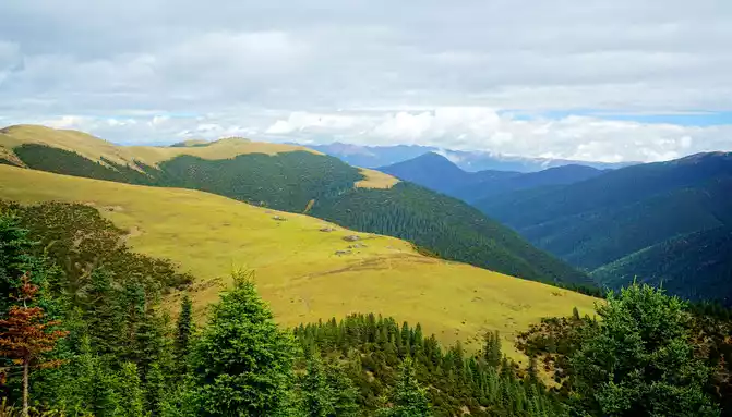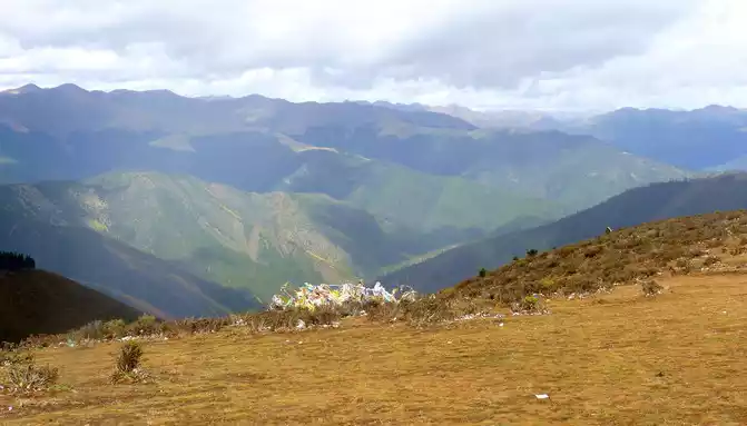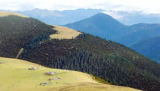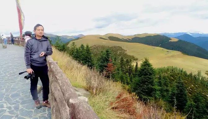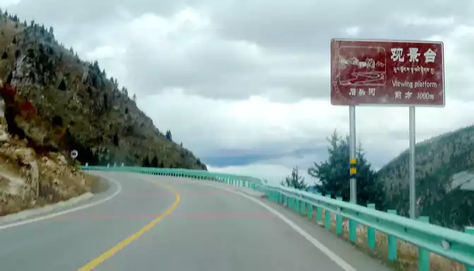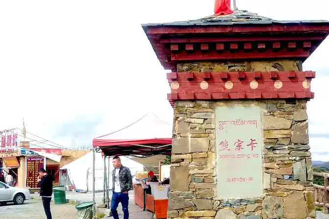 11:17 Stop at the "Xiong Zongka Observation Deck", the main attraction here is the alpine pasture, there is a long mountain beam opposite the observation deck, the top of the mountain is wide and flat, only the grass can not see a tree, but the ravines between the mountain beams are deep and treey, such a scenery reminds me of the man "Xie Ding", the top of his head is bald, but there is still a circle of hair around. The observation deck is equipped with a canteen, toilets, free parking lots, and a Tibetan-style pavilion monument, indicating that the place is 4,281 meters above sea level.