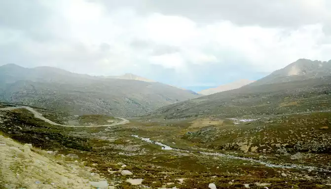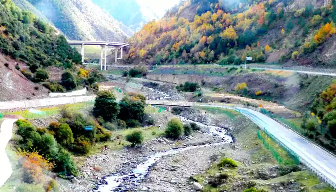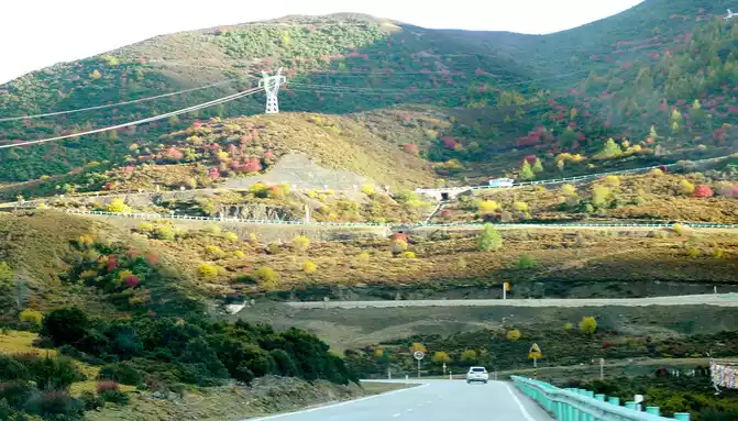 The main peak of Gao'er Temple Mountain is 4,659 meters above sea level, located about 5 kilometers west of the Y-junction, and at 8:56 you can see a fork in the road leading to the top of the mountain on the left, which is the only way to climb Gao'er Temple Mountain in the past. The Gaoersi Mountain Tunnel was built three years ago, and now this fork is rarely used. We crossed the fork and continued to move forward, and saw that the shrubs and grass on the hillside along the road had been changed into beautiful autumn clothes, and there were many cars parked on the side of the road, and passengers climbed over the road parapet and rushed down the hillside to take pictures. However, we are trying to arrive in Shangri-La Town before dark today, so we didn't stop here. The Hengduan Mountains are dangerous and steep, and avoiding driving at night is our top priority.