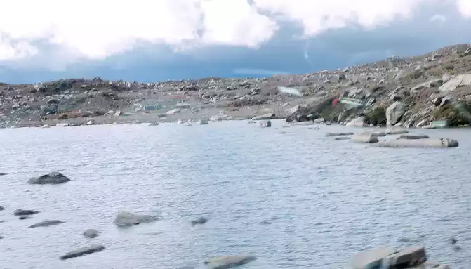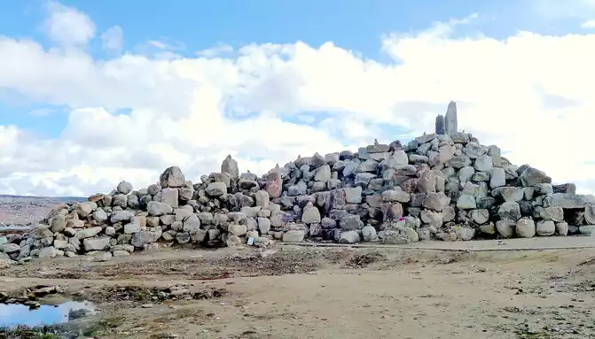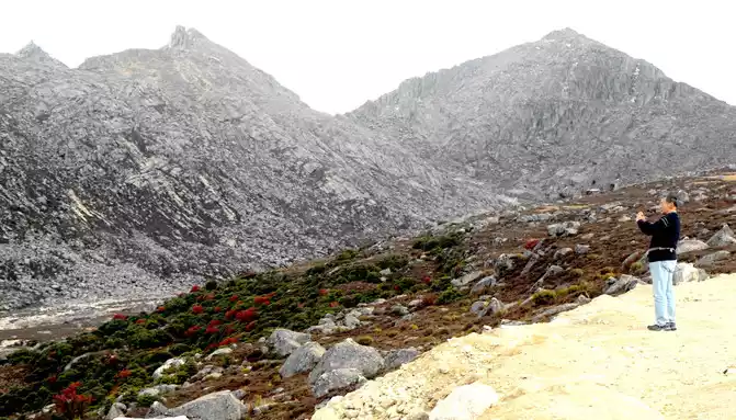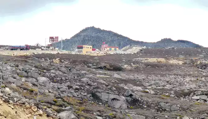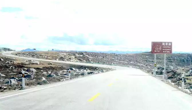 Continuing to move forward, we first passed through the river channel of an ancient glacier, and the glacier in ancient times ground the mountain beams through which it flowed into flat hills. At 15:11, we arrived at the "Rabbit Mountain Tourism Comprehensive Service Station" and stopped for a while, the landscape here is very peculiar, and the mountains are full of large and small broken stones, and no grass grows. Its most famous is the "rabbit" on the top of the mountain, so this mountain is called "Rabbit Mountain". There is an observation deck on the side of the road, and a boulder stands on the platform, indicating that the altitude here is 4,696 meters.