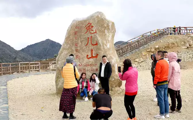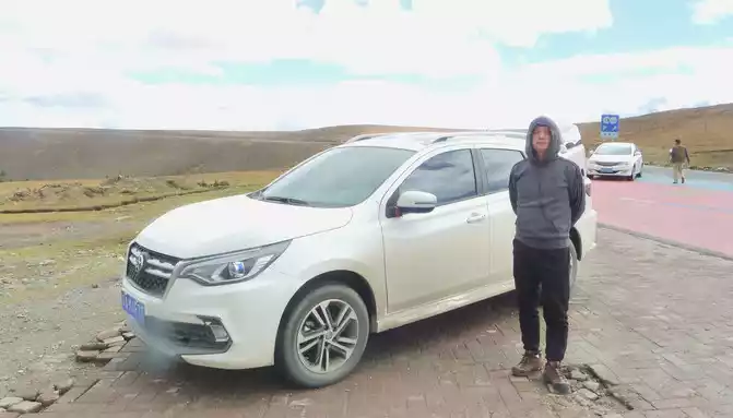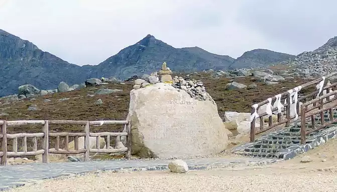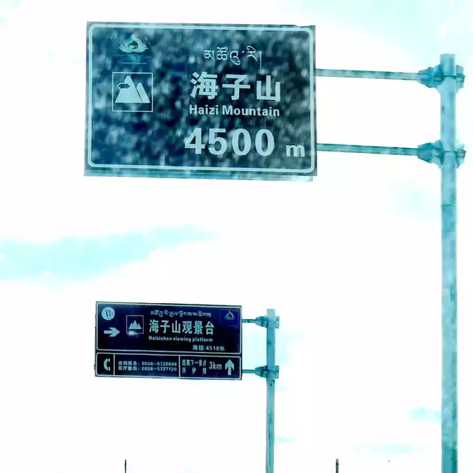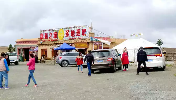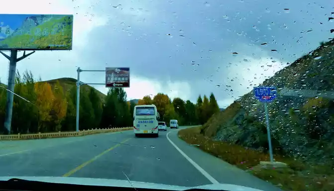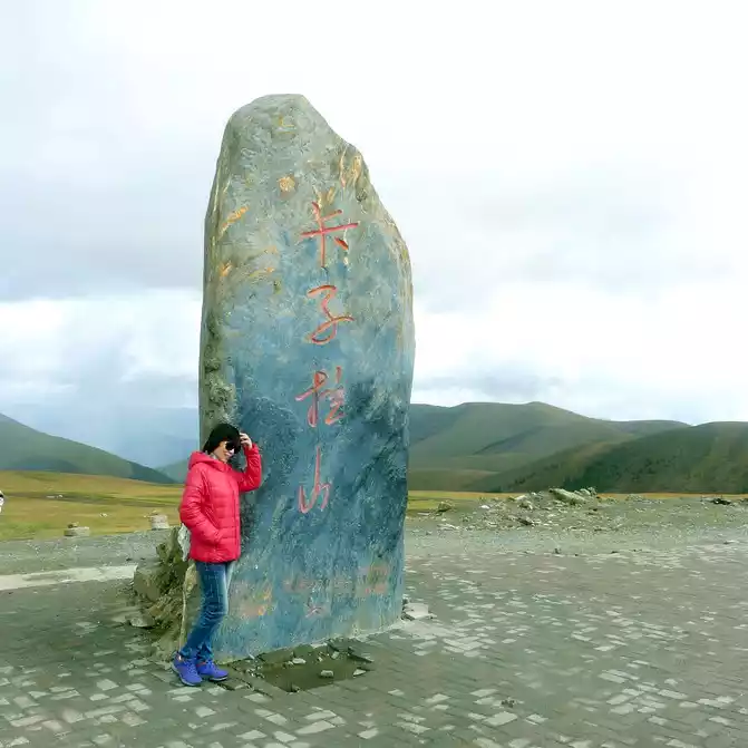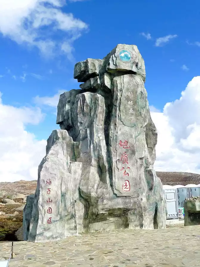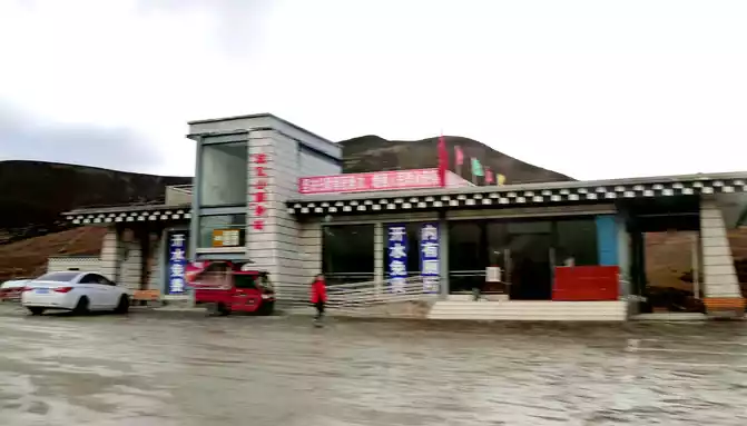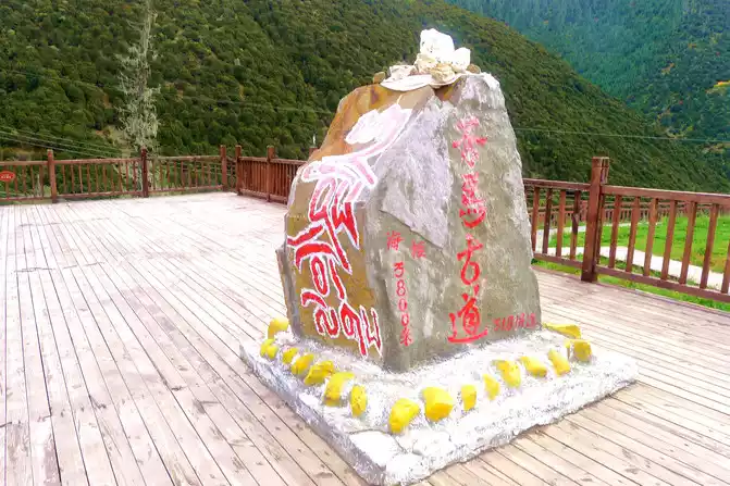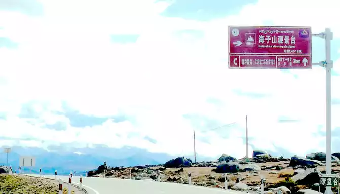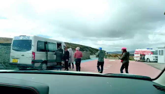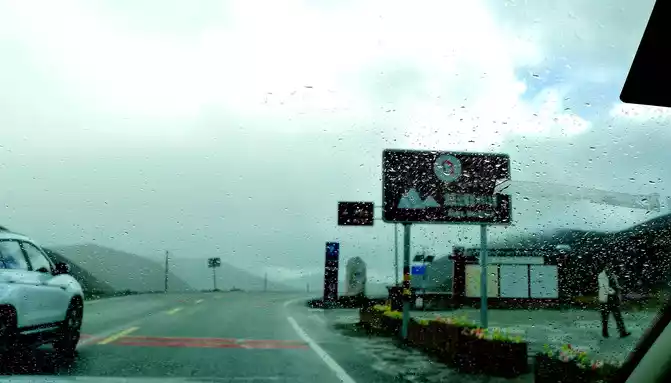 At 11:24, leave the "Xiongzongka Observation Deck" and continue to move forward, and at 11:43, drive through the "Nimagong Sacred Mountain Observation Deck Tourist Service Area" without parking. This area is a high-altitude area along the way, and the mountains seen are also bald, and the rain is briefly encountered during the journey, and the rain also carries ice slag, however, the weather on the plateau is also unpredictable, and it will be clear again after a while. 12:10 Park at the "Kazila Mountain Observation Deck", because it is a National Day holiday, there are also medical service vehicles from the nearby township health center on duty. There is a huge stone monument on the parking lot, indicating that the altitude of Mount Kazila is 4718 meters.