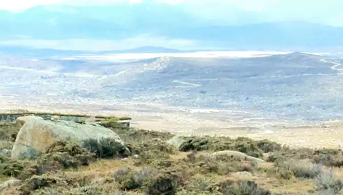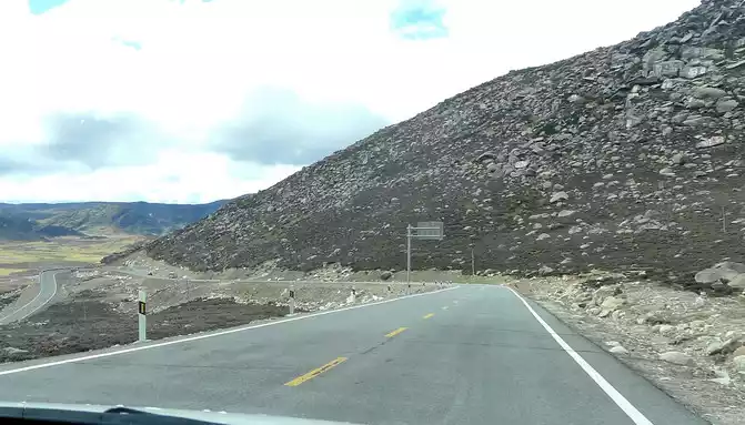 Continuing on, at 15:54, we encountered the "Haizi Mountain Observation Deck", the road sign showed that it was 4,500 meters above sea level, and we stayed for a while. There are simply built roads around the observation deck, and cars can leave the road and enter Stonehenge to park. We climbed up a high boulder and looked out, and then it was clear that we were on the top of the mountain, because the observation deck was located on the edge of the flat peak of Haizi Mountain, from where we could overlook the lake and road below the mountain.