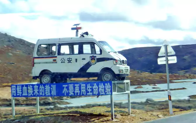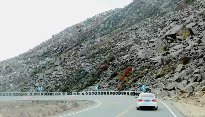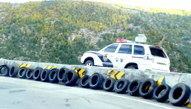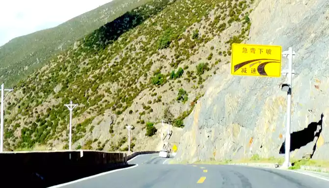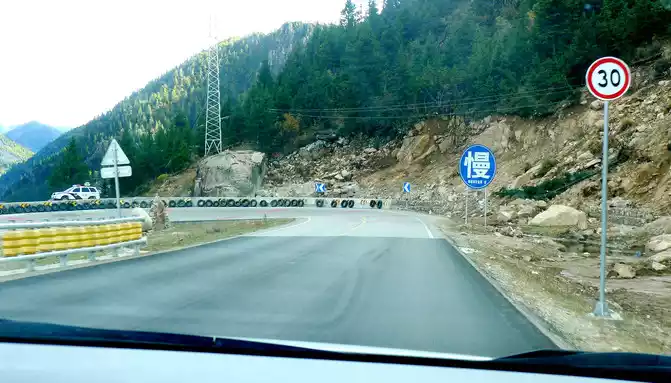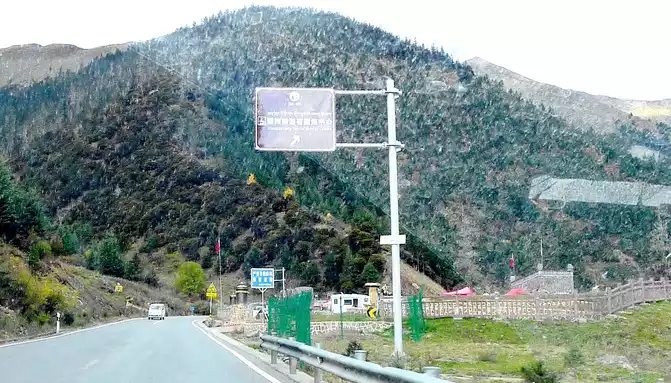 2 minutes from the airport intersection, we saw a "Shihe Park" on the side of the road, it is also called "Haizi Mountain Glacier Shihe Scenic Area", we drove straight by, there was no stop, because this place is still 115 kilometers away from Shangri-La Town, Daocheng County, where we are going to stay tonight, X.J. said that at least more than 2 hours of driving, in order to avoid walking at night, we can only temporarily cut off love here, and leave it for the return trip. Continuing down the mountain, the slope is steep and curved, the road speed limit is 30 kilometers, and another scrapped police car is placed here to scare passing drivers.