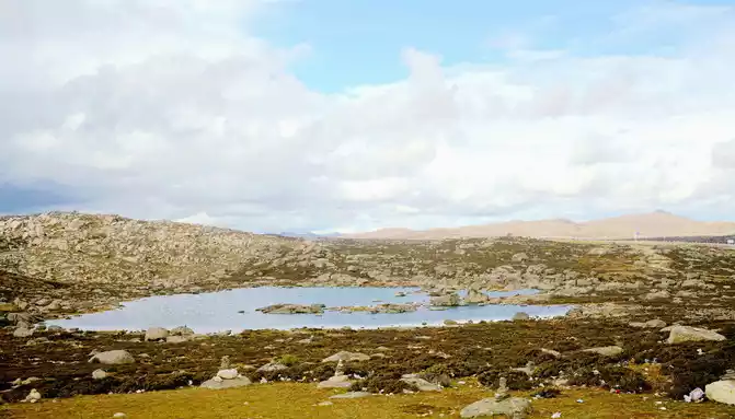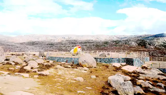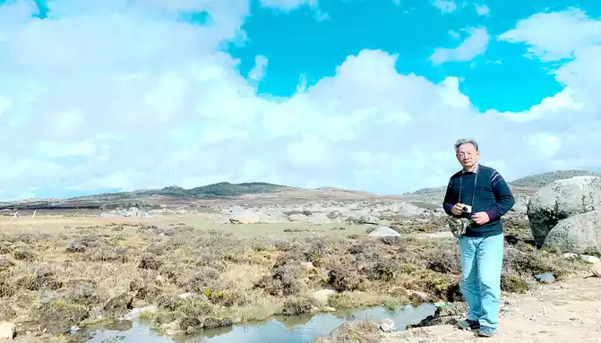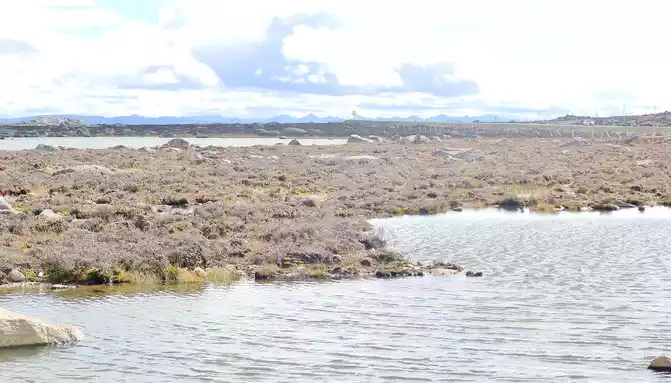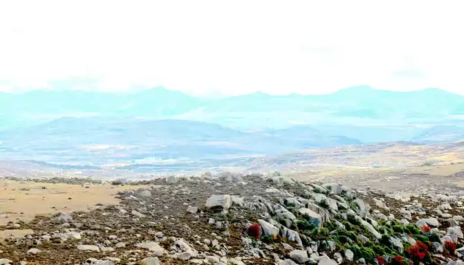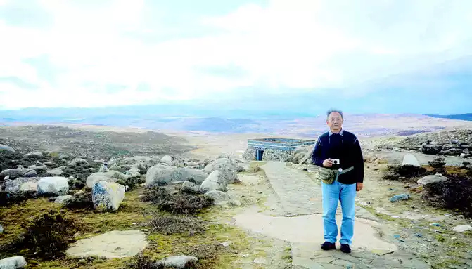 At 15:43, I stopped at a roadside parking lot, which should be regarded as the core scenic spot of Haizishan Geopark, next to the parking lot is a "cliff" made of cement, with the inscription "Geopark (Haizishan Park)", and there is also an artificial rockery made of natural stones nearby. Standing here and looking out, surrounded by endless meadows, scattered with large and small stones, as well as many water beaches and ponds, and in the distance are low hills, the scenery in front of me reminds me of the "grassland" that the Red Army walked through during the Long March, and I can't imagine that it is on the top of a mountain at an altitude of more than 4,000 meters. Haizi Mountain is a flat-topped mountain, because there are small lakes and pools dotted with flat tops (locally called "Haizi"), so it is named Haizi Mountain.