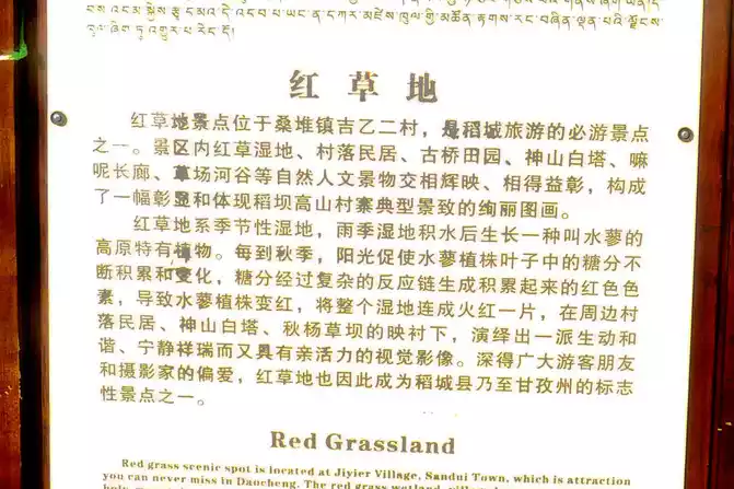 At 16:31, we saw a golden-roofed gatehouse on the left side of the road, and there were two golden-roofed temples on the mountain, so we didn't park. At 16:33, we encountered a T-junction, turned right to National Highway G549, leading to Xiangcheng and Derong, and we continued to go straight along National Highway G227, passing through Sangdui Town, and driving to Daocheng. Sangdui Town is 17 kilometers away from the famous scenic spot "Red Grassland", 28 kilometers away from the urban area of Daocheng County, and 138 kilometers away from the Aden Scenic Area. At 16:52, we arrived at the "Red Grassland", also known as the "Red Grass Wetland Park", located in Jiyi Second Village, Sangdui Town, not far from Daocheng County. The "Red Grassland" scenic spot is on the side of the road, and you can enter and exit at will, but the parking lot is charged, and each car is 10 yuan, which should be regarded as a welfare for the local village.