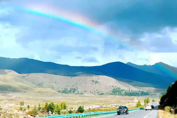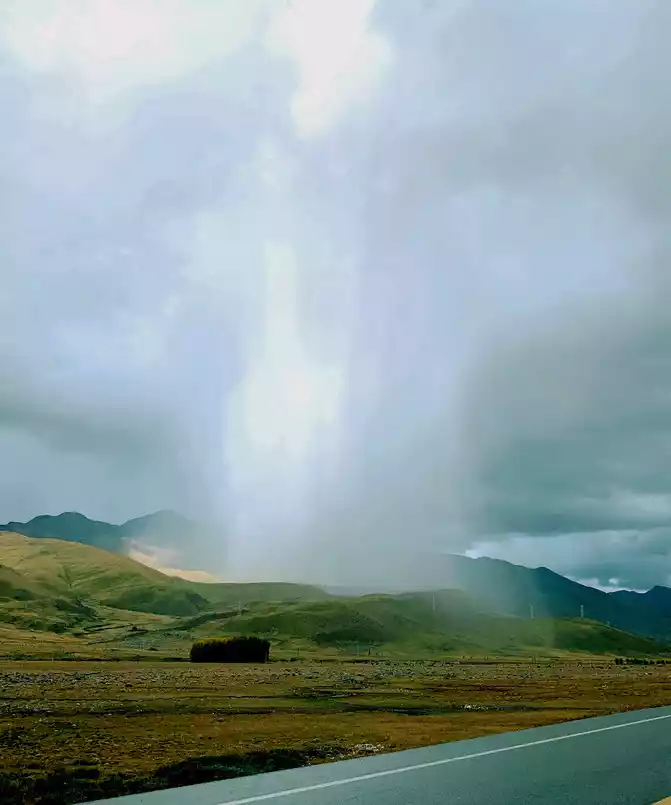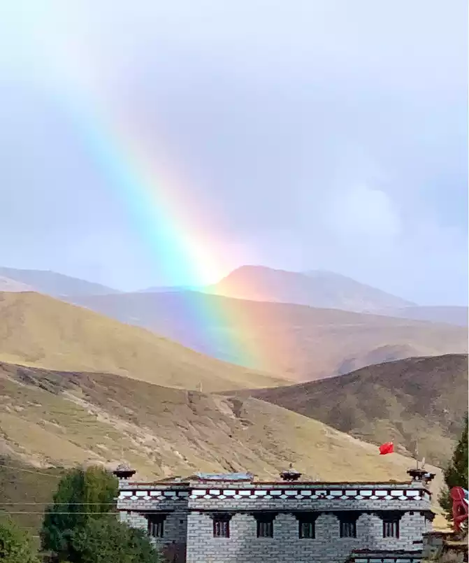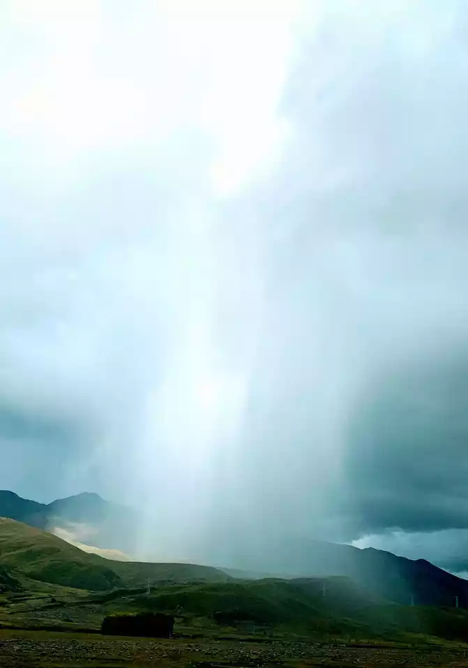 After staying in the "red grassland" for about 25 minutes, the sky suddenly darkened, dark clouds overhead, and a heavy rain came unexpectedly. However, this violent precipitation was only concentrated on a small hill not far from us, and there was almost no rain around, and it looked like a huge waterfall falling from the sky from a distance, and the scene was extremely spectacular, which was the real "Milky Way falling for nine days". The rainstorm on the plateau came and went in a hurry, and after a while, the rain cleared up, and a beautiful rainbow appeared.