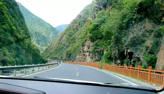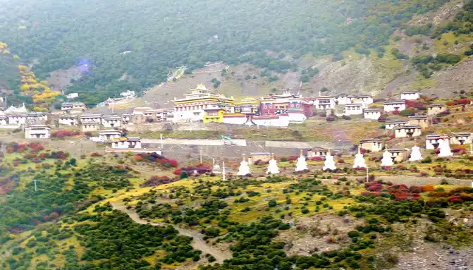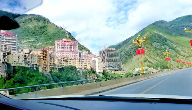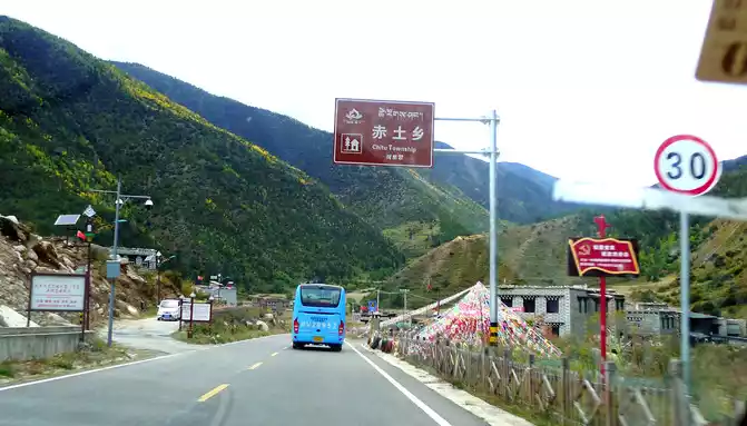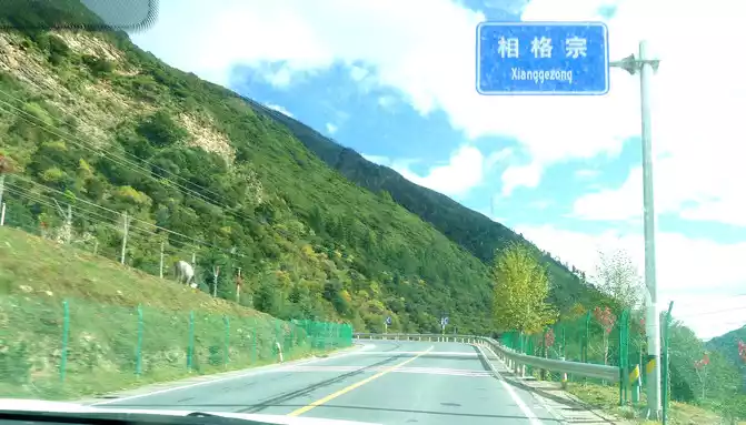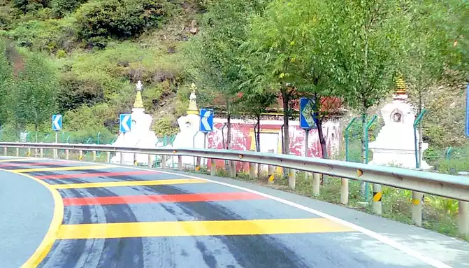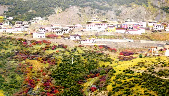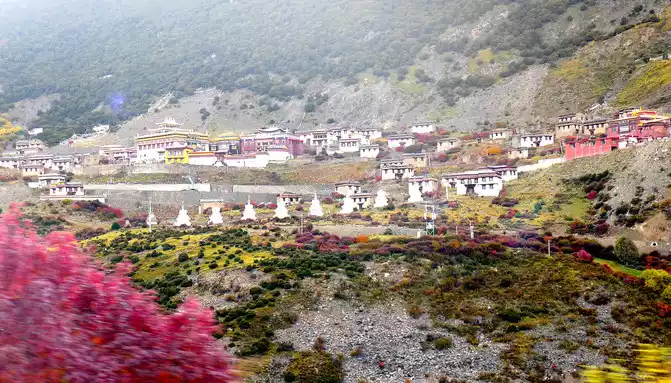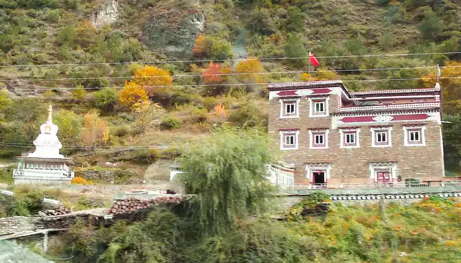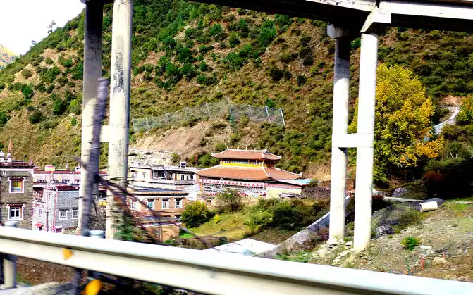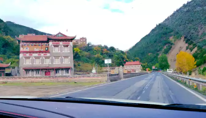At 9:33, we drove to the bottom of the ravine, where there is a village and a temple called "Wolong Temple", and the small village is "Wolong Temple Village". Then it was still driving in the valley, and there was a small river running parallel to the road, but compared with the ravine just now, the slope at this time was significantly gentler, and it was generally no different from a flat road. From time to time, beautiful Tibetan buildings can be seen on the roadside, including many inns and homestays.