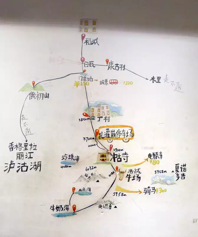 After dinner, I went back to the hotel and listened to a donkey friend who had just walked the long line in Aden, he said that there was no need to ride a horse at all, 300 yuan was only one way, and only the flat road in front of it was really difficult, and the back part of the mountain had to be walked by himself. However, after returning to the room, X.J. said that he would try to ride a horse tomorrow, and then climb the mountain road to see the situation, and if he could, he would go to the Milk Sea. There is a hand-drawn map of Aden scenic spots in the hotel lobby, which you can take a picture of.