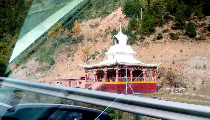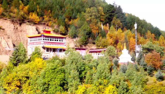 After staying for about 5 minutes, we hurriedly hit the road, passing the "Salad Sea" observation deck at 17:43, and this time we will never stop. Continuing to drive, I saw a big mountain in front of me, and at 17:52 I started to circle and climb, the winding road was layered, and the trees on the side of the road were colorful, which felt really beautiful. Circling to the top of the mountain and looking back, the road we walked on was like a long snake, winding through the valley. The road on the mountain goes straight along a valley, there is a temple on the opposite mountain beam, and the surrounding vegetation is full of autumn, and the red, orange, yellow and green set off the golden-roofed temple, which is particularly beautiful. Later, it was learned that this temple was called "Rewu Temple".