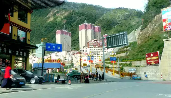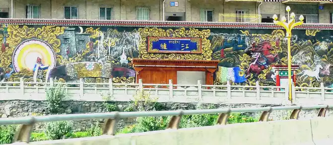At 9:52, we drove through Octagonal Tower Township, refueled at the "Yajiang City Gas Station" at 10:11, and arrived at the "Hekou Town" located on the east bank of the "Yalong River" at 10:15, where the small river that accompanied us all the way joined the Yalong River. Yajiang County is mainly built on the west bank of the Yalong River, which can be reached directly from Hekou Town, but we did not cross the bridge, but followed the national highway G318 to turn right, cross the "Yajiang Tunnel", and then go straight along the elevated river road on the east bank of the Yalong River, cross the river through a bridge in front, bypass Yajiang County, and drive directly to the direction of Litang. There is a beautiful wall sculpture at the intersection of the county seat, I don't know what story it describes, I guess it is "King Gesar".
